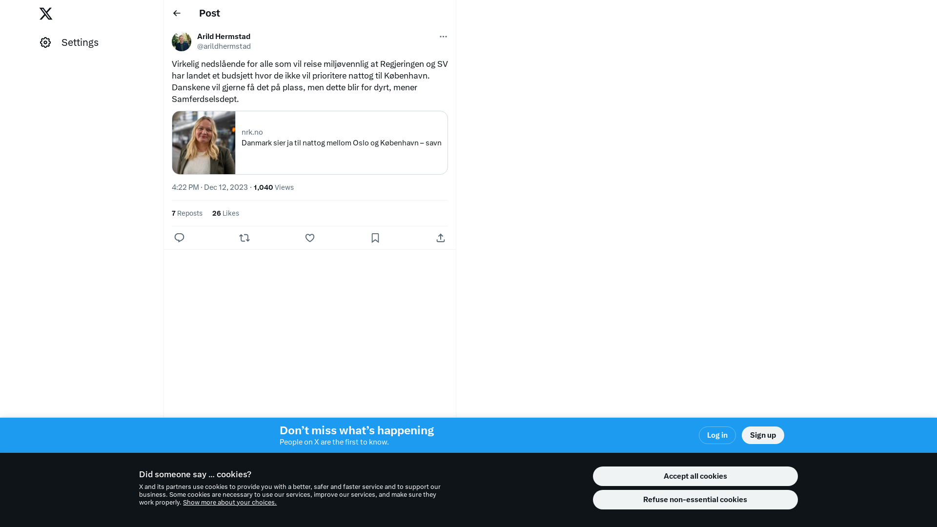 Virkelig nedslående for alle som vil reise miljøvennlig at Regjeringen og SV har landet et budsjett hvor de ikke vil prioritere nattog til København. Danskene vil gjerne få det på plass, men dette blir for dyrt, mener Samferdselsdept. https://t.co/at6kmvOkf4