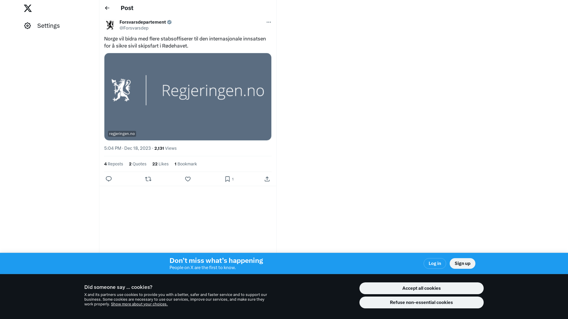 Norge vil bidra med flere stabsoffiserer til den internasjonale innsatsen for å sikre sivil skipsfart i Rødehavet.\n\nhttps://t.co/w6zuIxtTRp