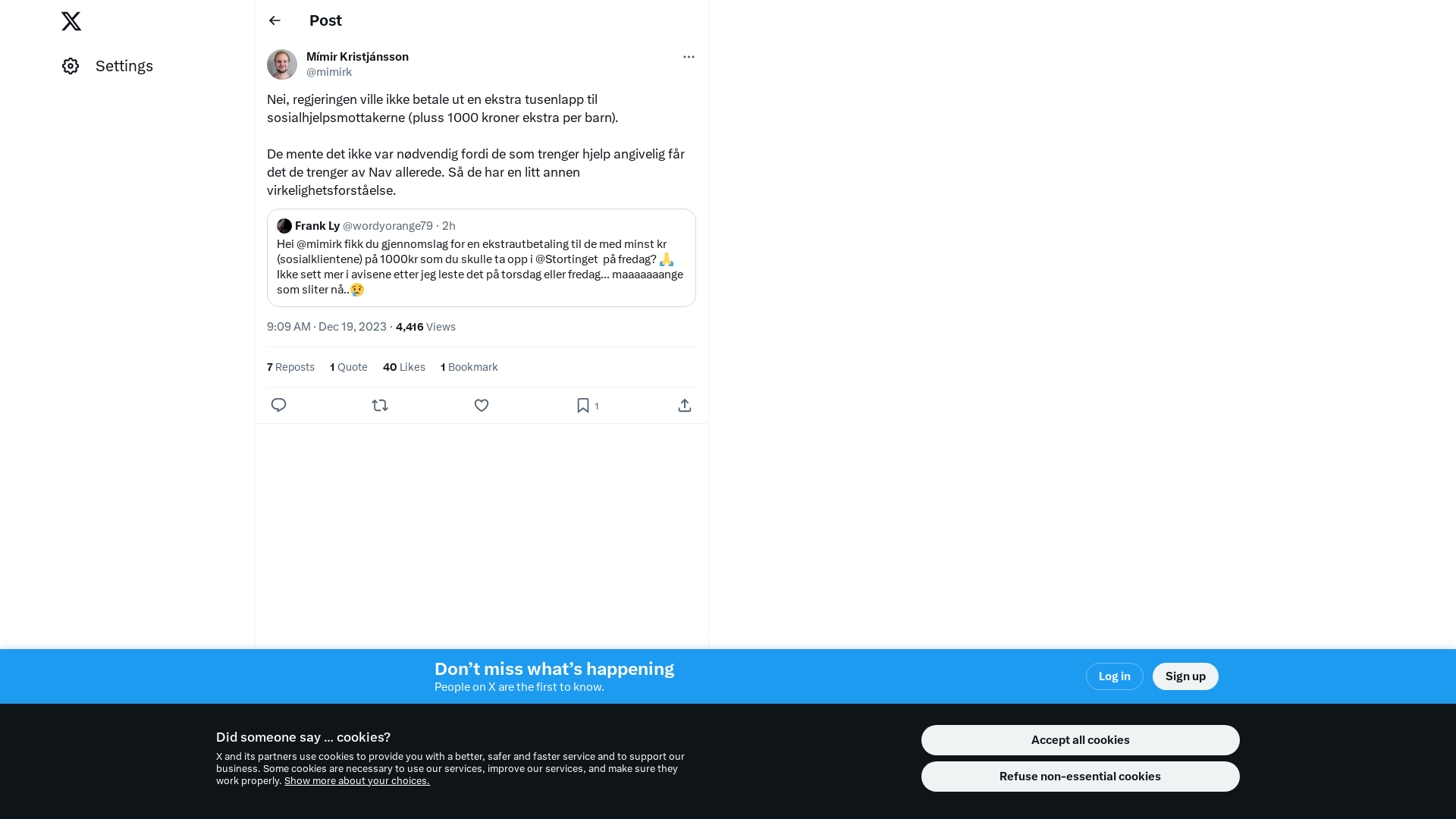 Nei, regjeringen ville ikke betale ut en ekstra tusenlapp til sosialhjelpsmottakerne (pluss 1000 kroner ekstra per barn). \n\nDe mente det ikke var nødvendig fordi de som trenger hjelp angivelig får det de trenger av Nav allerede. Så de har en litt annen virkelighetsforståelse.