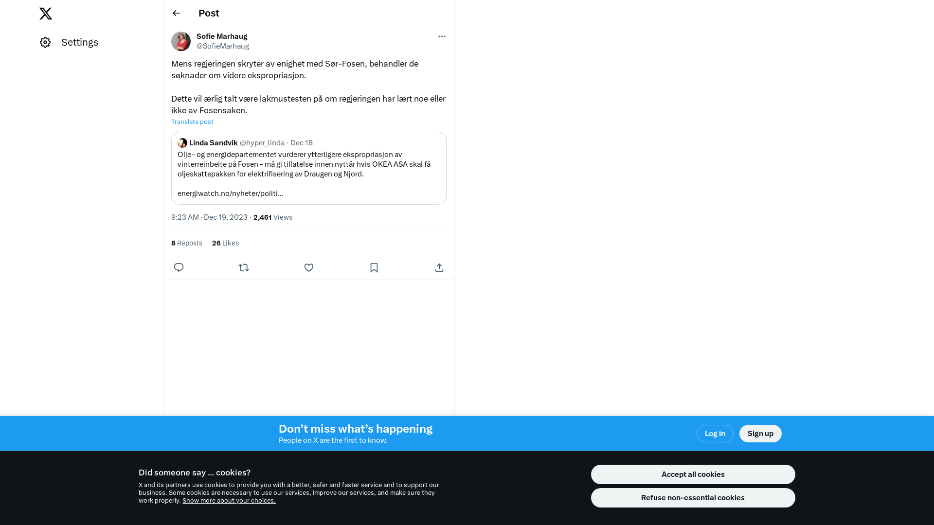 Mens regjeringen skryter av enighet med Sør-Fosen, behandler de søknader om videre ekspropriasjon. \n\nDette vil ærlig talt være lakmustesten på om regjeringen har lært noe eller ikke av Fosensaken.