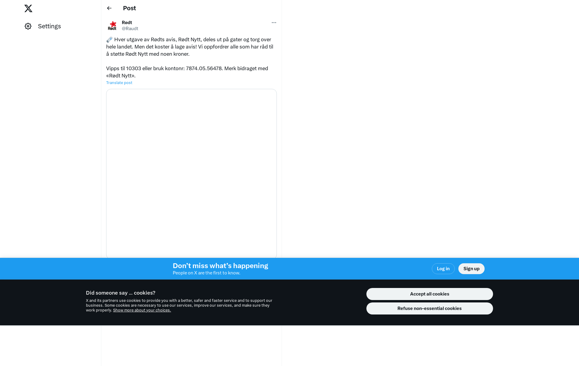 🗞️ Hver utgave av Rødts avis, Rødt Nytt, deles ut på gater og torg over hele landet. Men det koster å lage avis! Vi oppfordrer alle som har råd til å støtte Rødt Nytt med noen kroner.\n\nVipps til 10303 eller bruk kontonr: 7874.05.56478. Merk bidraget med «Rødt Nytt». https://t.co/fzuGeNn29l
