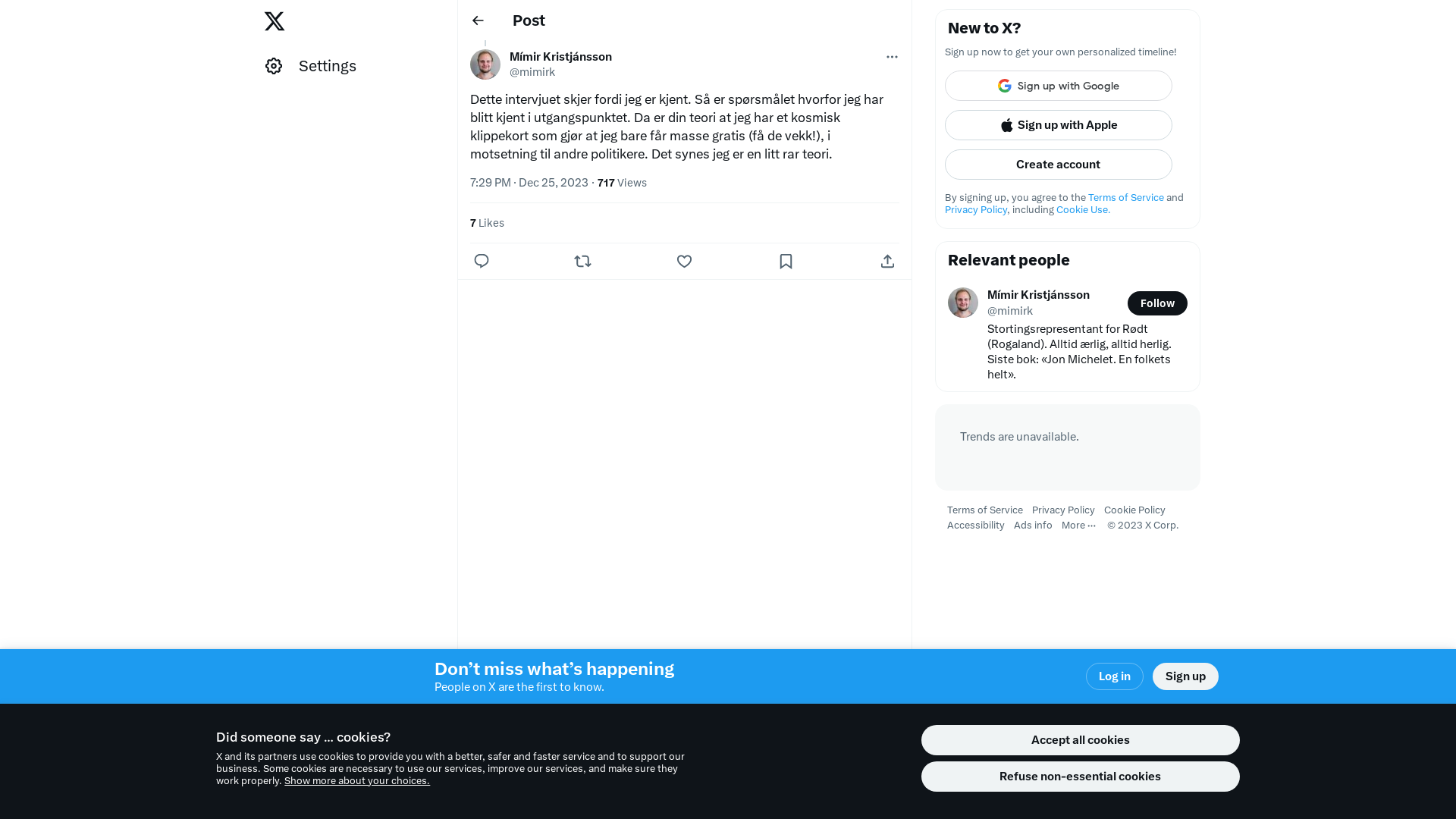 @jabbidabbadoo Dette intervjuet skjer fordi jeg er kjent. Så er spørsmålet hvorfor jeg har blitt kjent i utgangspunktet. Da er din teori at jeg har et kosmisk klippekort som gjør at jeg bare får masse gratis (få de vekk!), i motsetning til andre politikere. Det synes jeg er en litt rar teori.