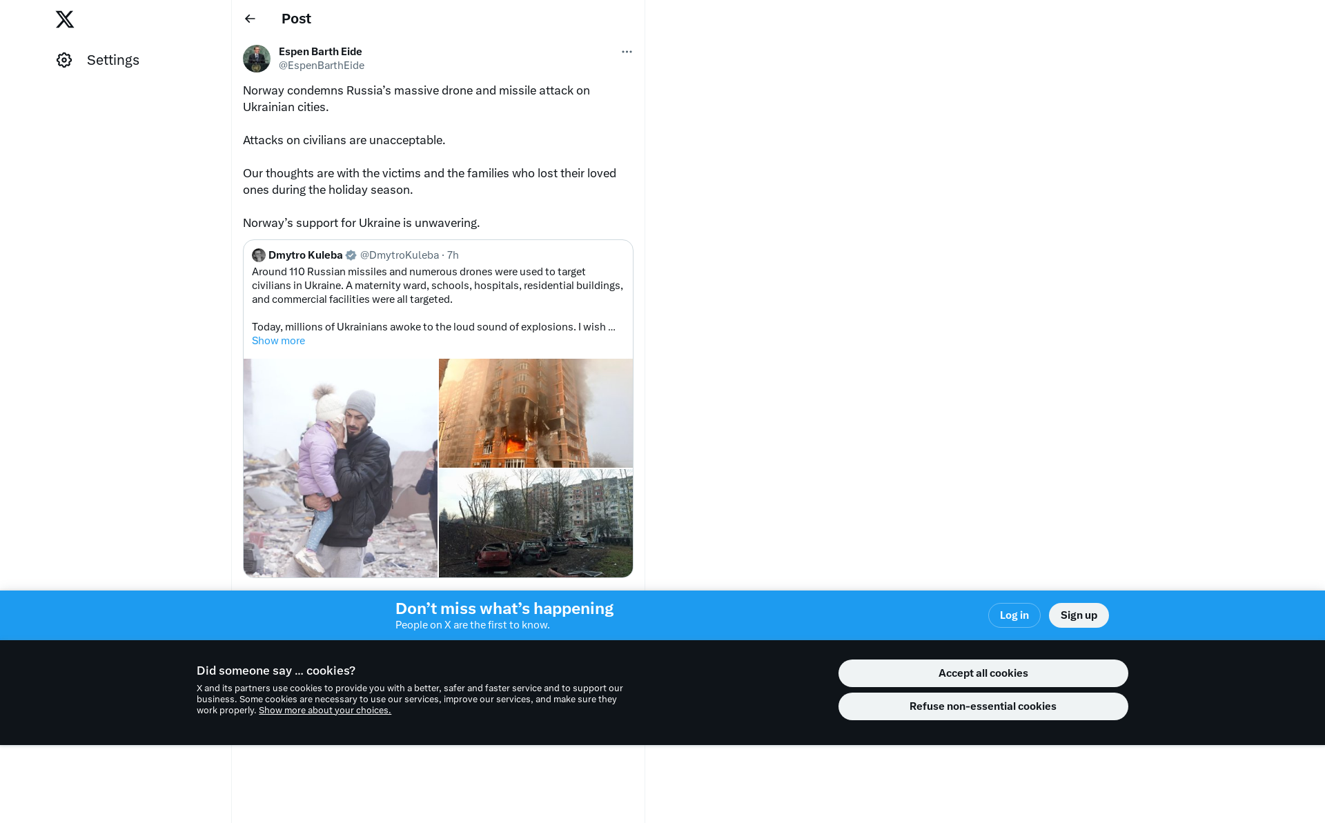 Norway condemns Russia’s massive drone and missile attack on Ukrainian cities.\n\nAttacks on civilians are unacceptable.\n\nOur thoughts are with the victims and the families who lost their loved ones during the holiday season.\n\nNorway’s support for Ukraine is unwavering.