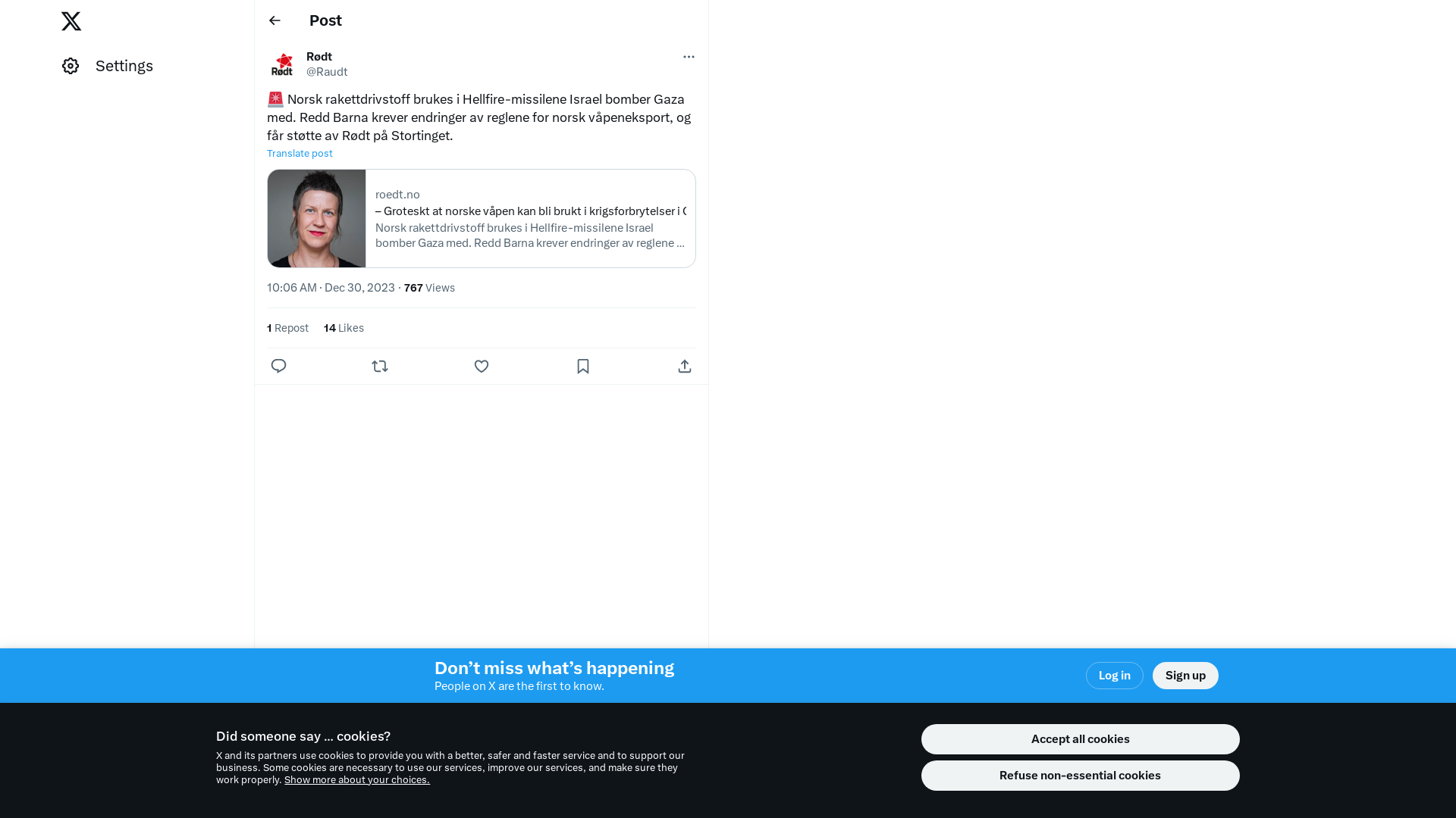 🚨 Norsk rakettdrivstoff brukes i Hellfire-missilene Israel bomber Gaza med. Redd Barna krever endringer av reglene for norsk våpeneksport, og får støtte av Rødt på Stortinget.\n\nhttps://t.co/Lxgo4y0L0u