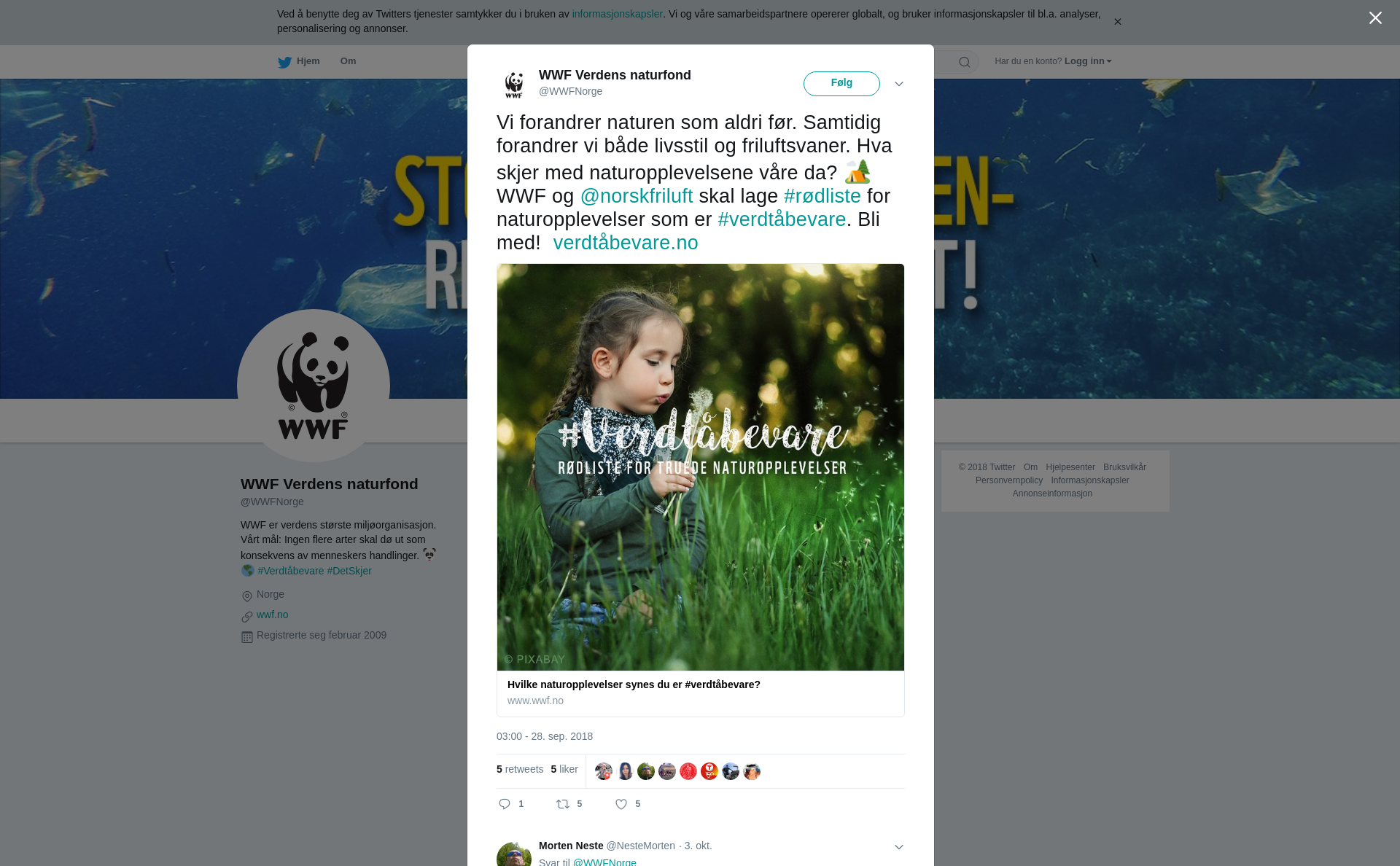 RT @WWFNorge: Vi forandrer naturen som aldri før. Samtidig forandrer vi både livsstil og friluftsvaner. Hva skjer med naturopplevelsene våre da? 🏕️ WWF og @norskfriluft skal lage #rødliste for naturopplevelser som er #verdtåbevare. Bli med! https://t.co/GlRnWYVUN2