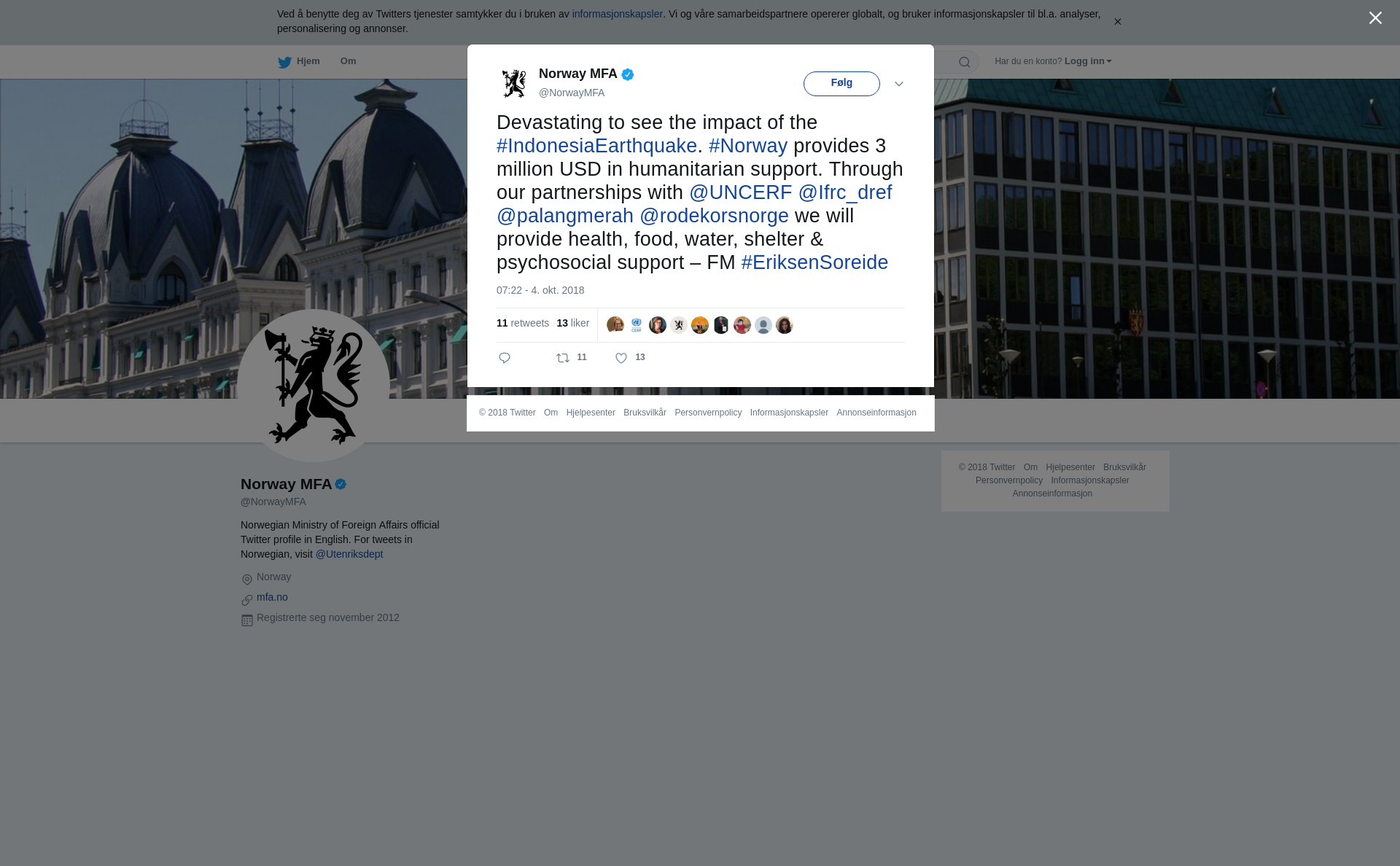 Devastating to see the impact of the #IndonesiaEarthquake. #Norway provides 3 million USD in humanitarian support. Through our partnerships with @UNCERF @Ifrc_dref @palangmerah @rodekorsnorge we will provide health, food, water, shelter & psychosocial support – FM #EriksenSoreide