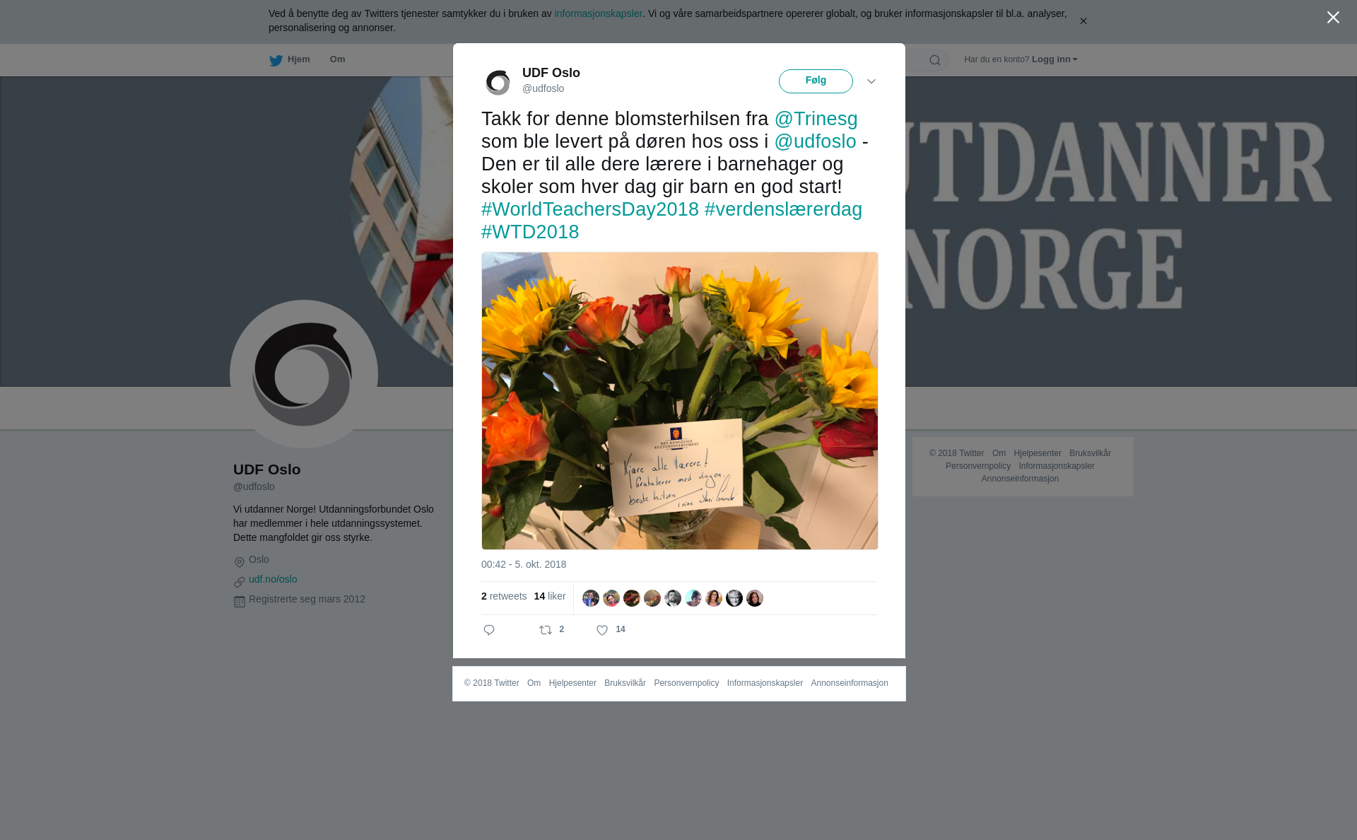 RT @udfoslo: Takk for denne blomsterhilsen fra @Trinesg som ble levert på døren hos oss i @udfoslo - Den er til alle dere lærere i barnehager og skoler som hver dag gir barn en god start! #WorldTeachersDay2018 #verdenslærerdag #WTD2018 https://t.co/FgfliCpOCT