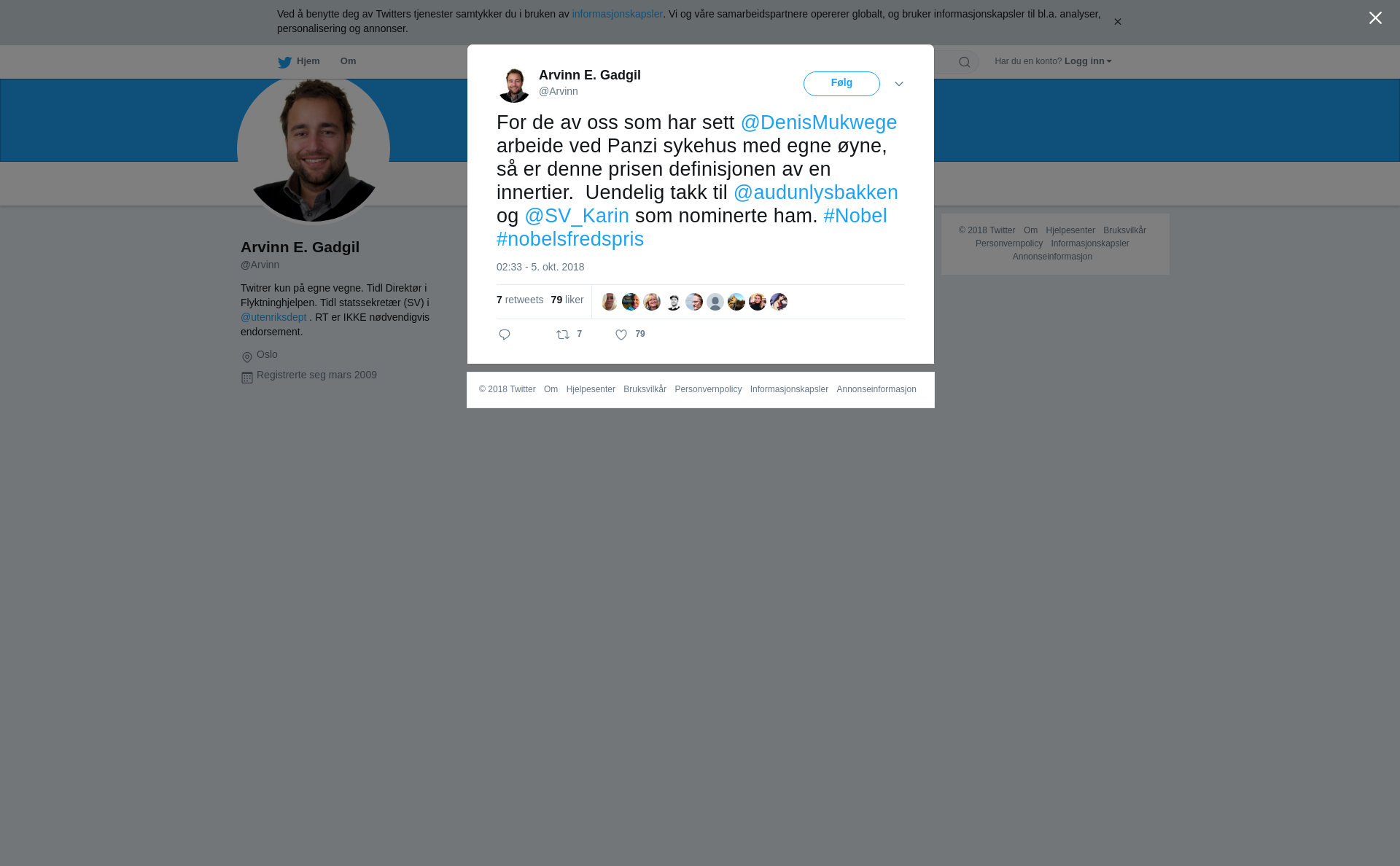 RT @Arvinn: For de av oss som har sett @DenisMukwege arbeide ved Panzi sykehus med egne øyne, så er denne prisen definisjonen av en innertier. Uendelig takk til @audunlysbakken og @SV_Karin som nominerte ham. #Nobel #nobelsfredspris