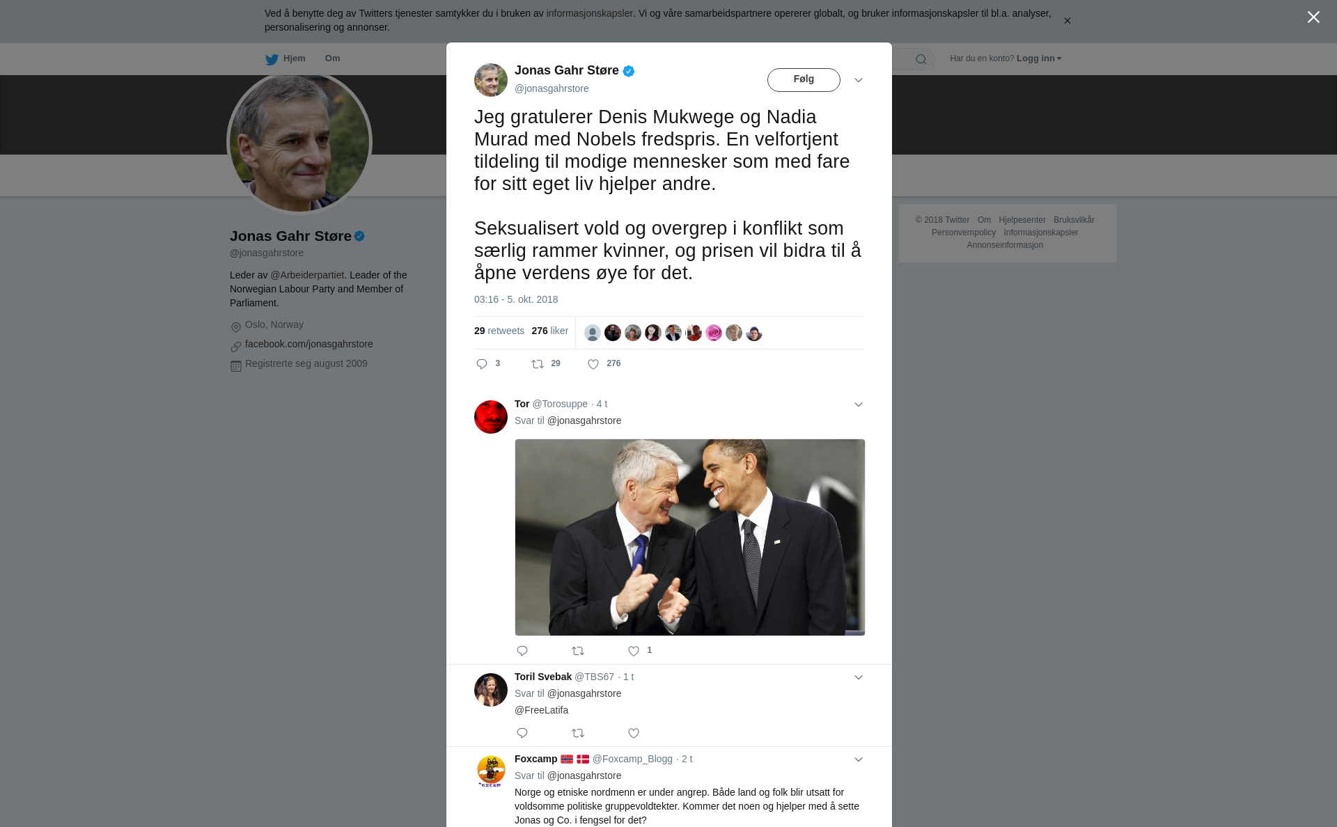 RT @jonasgahrstore: Jeg gratulerer Denis Mukwege og Nadia Murad med Nobels fredspris. En velfortjent tildeling til modige mennesker som med fare for sitt eget liv hjelper andre.