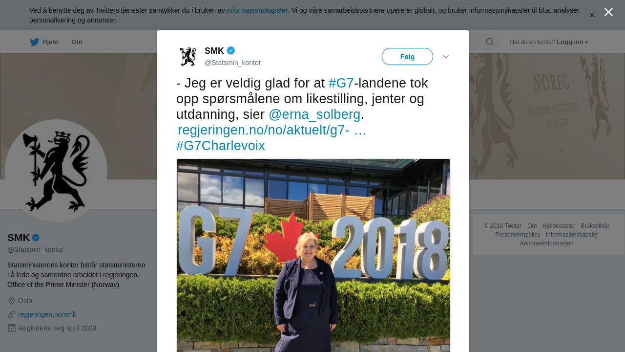- Jeg er veldig glad for at #G7-landene tok opp spørsmålene om likestilling, jenter og utdanning, sier @erna_solberg. https://t.co/XVQQRH3G6Z #G7Charlevoix https://t.co/rcjA5KGj0e