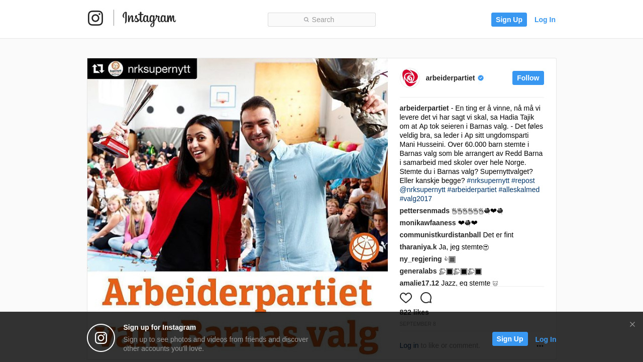 - En ting er å vinne, nå må vi levere det vi har sagt vi skal, sa Hadia Tajik om at Ap tok seieren i Barnas valg. - Det føles veldig bra, sa leder i Ap sitt ungdomsparti Mani Husseini. Over 60.000 barn stemte i Barnas valg som ble arrangert av Redd Barna i samarbeid med skoler over hele Norge. Stemte du i Barnas valg? Supernyttvalget? Eller kanskje begge? #nrksupernytt #repost @nrksupernytt #arbeiderpartiet #alleskalmed #valg2017