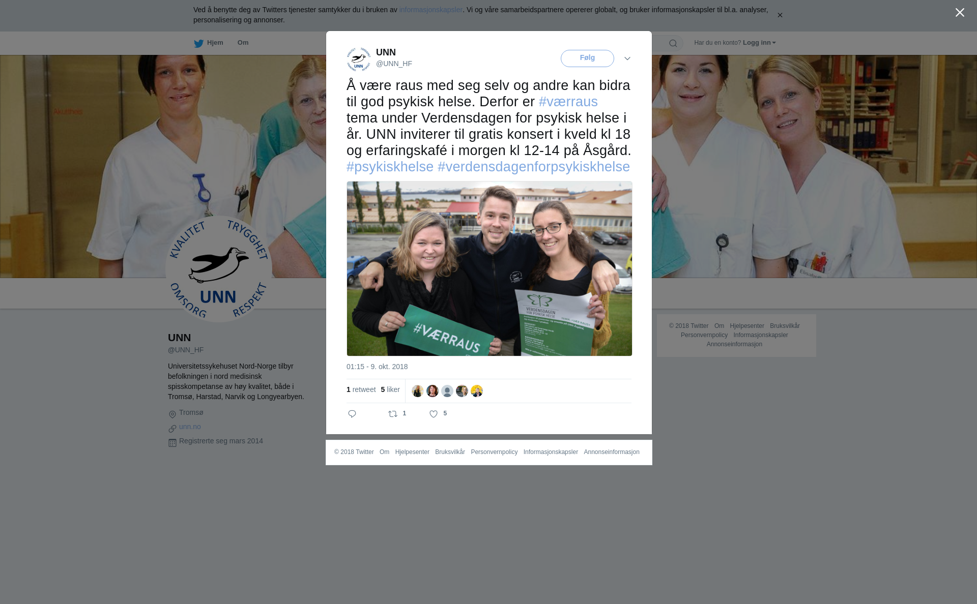 RT @UNN_HF: Å være raus med seg selv og andre kan bidra til god psykisk helse. Derfor er #værraus tema under Verdensdagen for psykisk helse i år. UNN inviterer til gratis konsert i kveld kl 18 og erfaringskafé i morgen kl 12-14 på Åsgård. #psykiskhelse #verdensdagenforpsykiskhelse https://t.co/k4ykqpRLFE