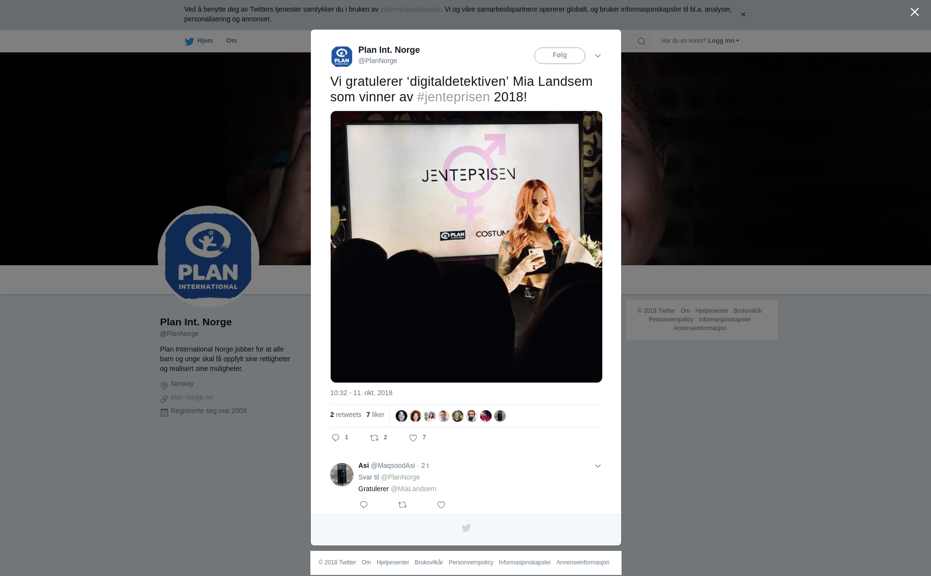 RT @PlanNorge: Vi gratulerer ‘digitaldetektiven’ Mia Landsem som vinner av #jenteprisen 2018! https://t.co/rkX9VVlXPW