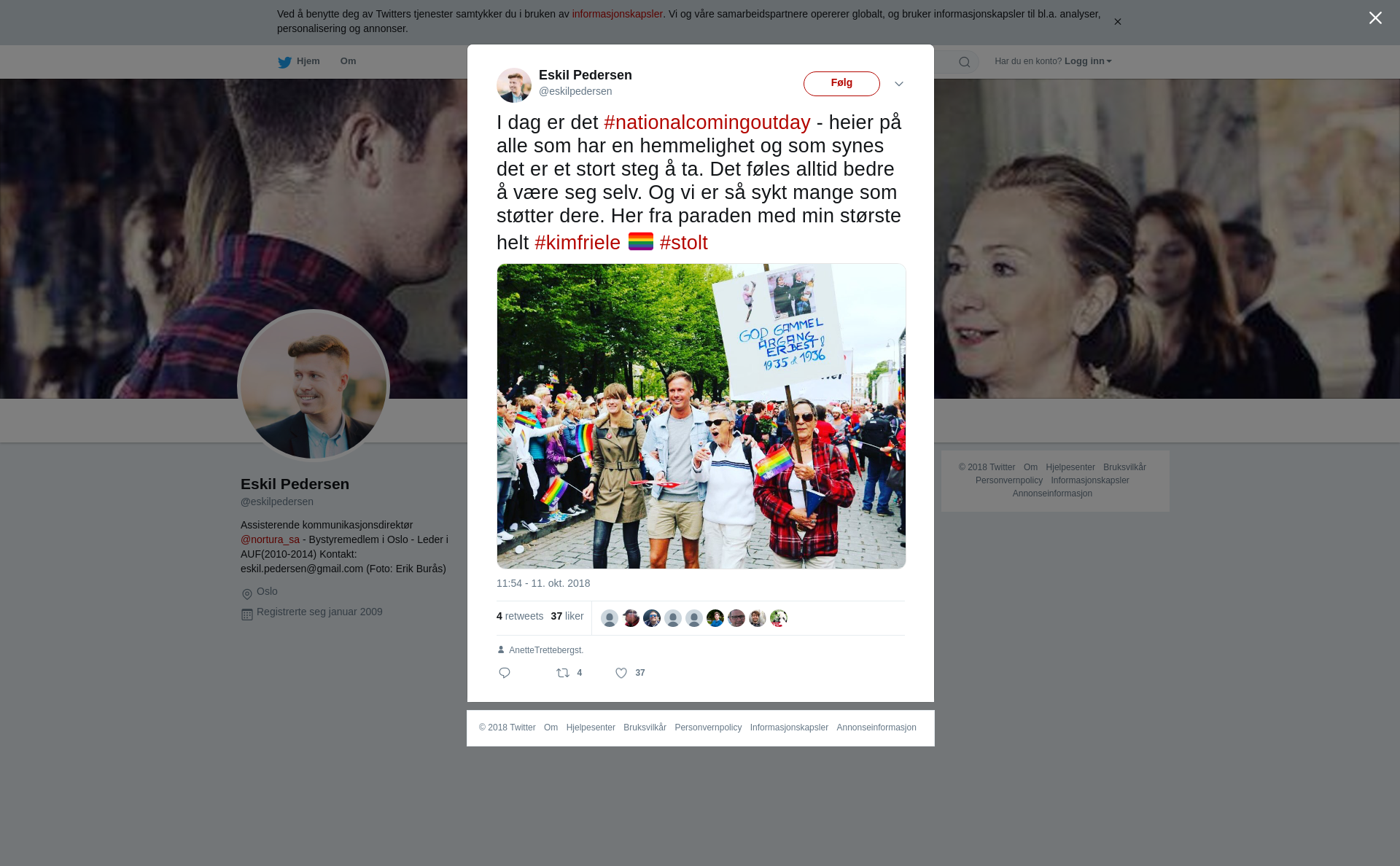 RT @eskilpedersen: I dag er det #nationalcomingoutday - heier på alle som har en hemmelighet og som synes det er et stort steg å ta. Det føles alltid bedre å være seg selv. Og vi er så sykt mange som støtter dere. Her fra paraden med min største helt #kimfriele 🏳️🌈 #stolt https://t.co/hs8EyIYHAz