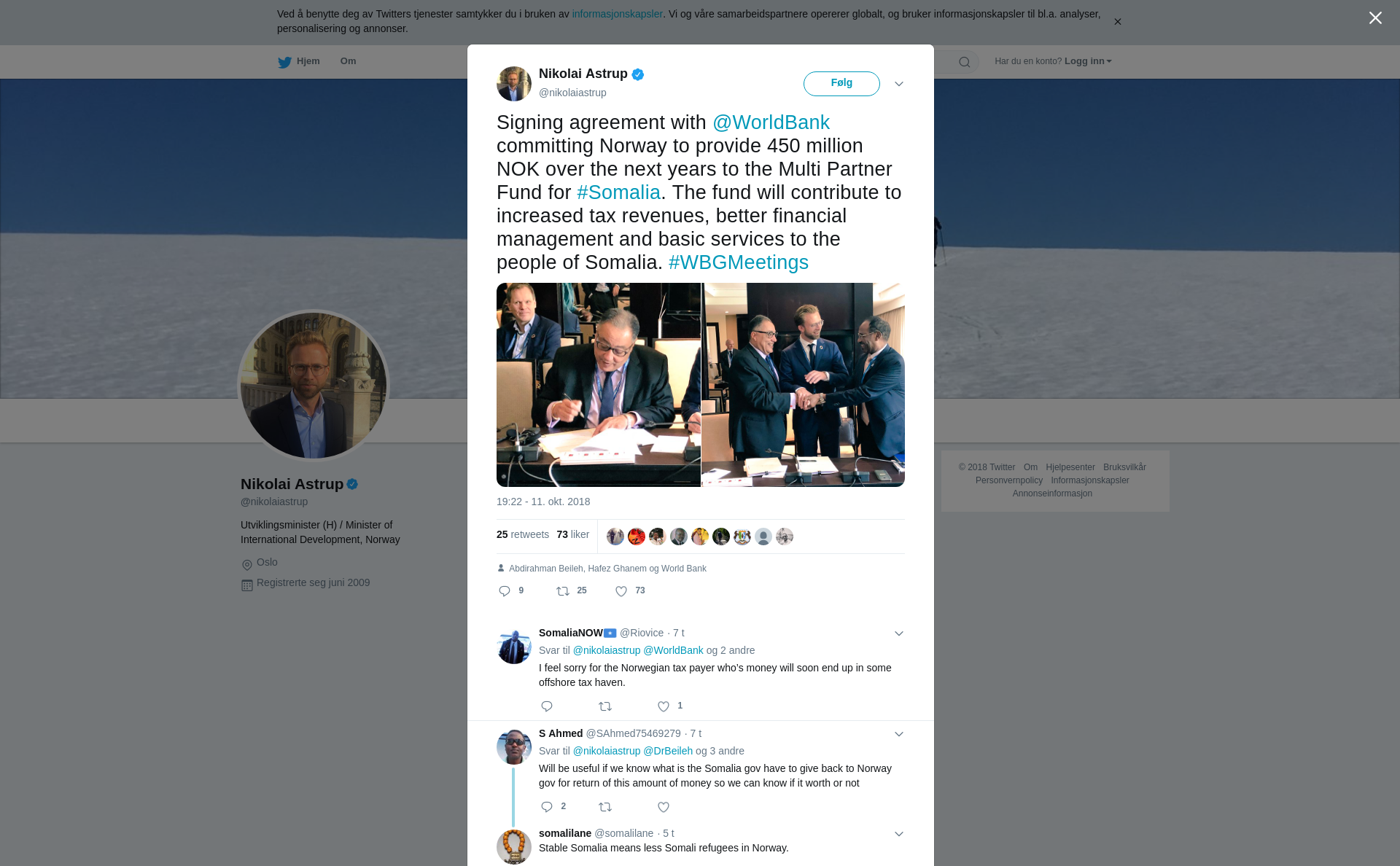 RT @nikolaiastrup: Signing agreement with @WorldBank committing Norway to provide 450 million NOK over the next years to the Multi Partner Fund for #Somalia. The fund will contribute to increased tax revenues, better financial management and basic services to the people of Somalia. #WBGMeetings https://t.co/C5PUcFTjJz