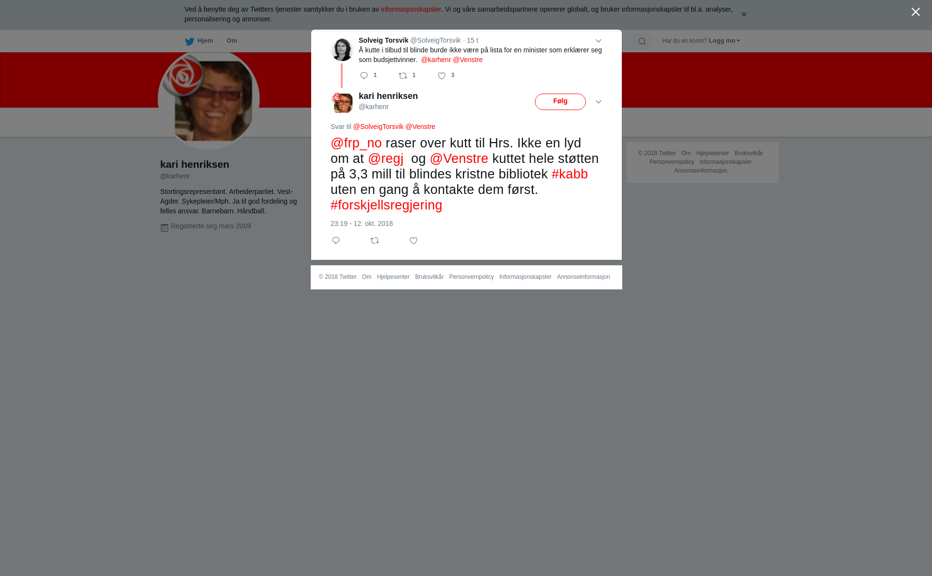 @SolveigTorsvik @Venstre @frp_no raser over kutt til Hrs. Ikke en lyd om at @regj og @Venstre kuttet hele støtten på 3,3 mill til blindes kristne bibliotek #kabb uten en gang å kontakte dem først. #forskjellsregjering