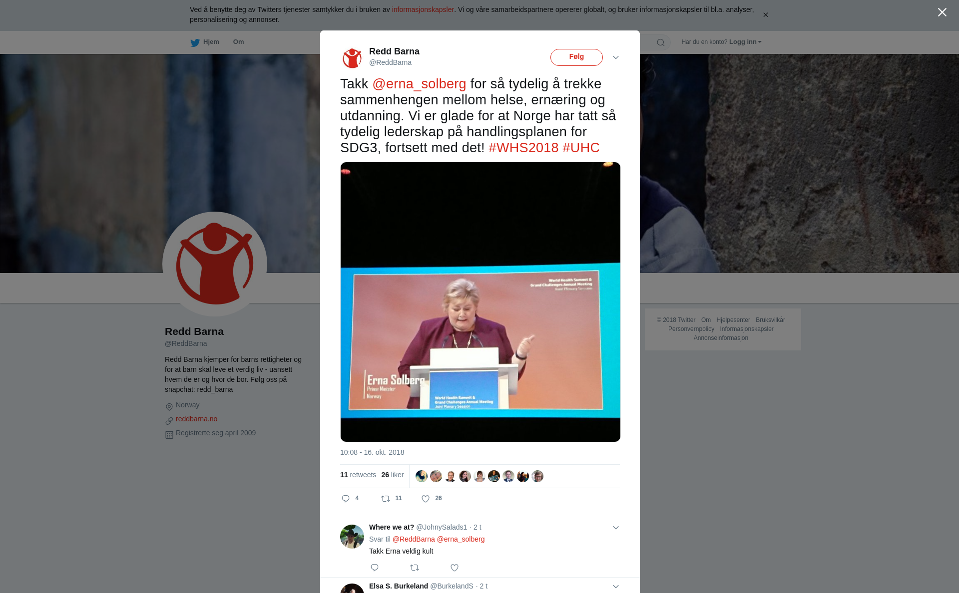 RT @ReddBarna: Takk @erna_solberg for så tydelig å trekke sammenhengen mellom helse, ernæring og utdanning. Vi er glade for at Norge har tatt så tydelig lederskap på handlingsplanen for SDG3, fortsett med det! #WHS2018 #UHC https://t.co/NgDsth9yIS