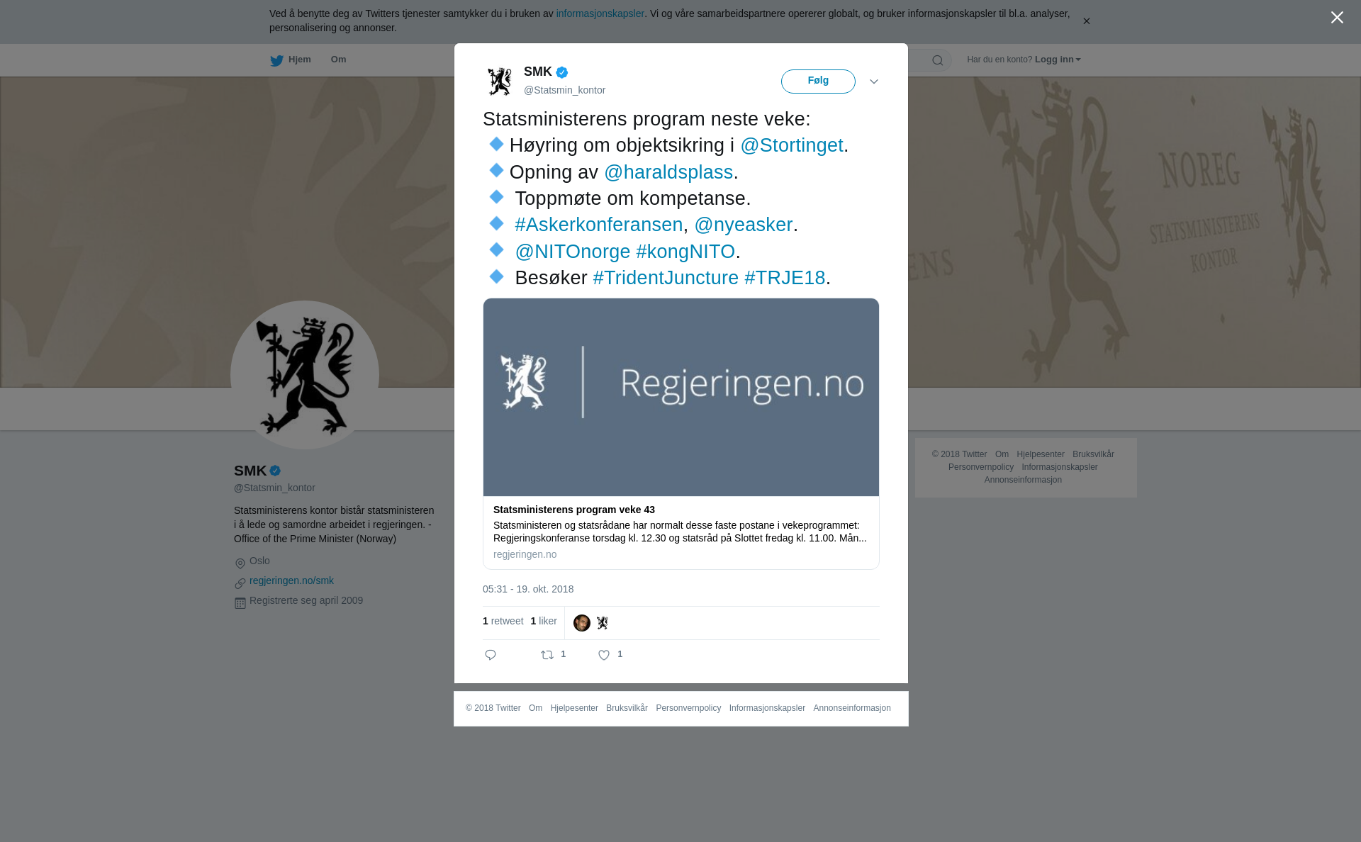 Statsministeren og statsrådane har normalt desse faste postane i vekeprogrammet: Regjeringskonferanse torsdag kl. 12.30 og statsråd på Slottet fredag kl. 11.00. Måndag 22. oktober Kl. 15.10: Statsminister Erna Solberg deltek i Kontroll- og konstitusjon...