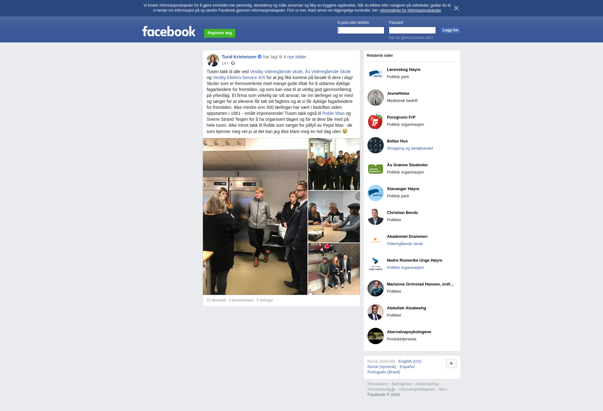 Tusen takk til alle ved Vestby videregående skole, Ås Videregående Skole og Vestby Elektro-Service A/S for at jeg fikk komme på besøk til dere i dag! Skoler som er fremoverlente med mange gode tiltak for å utdanne dyktige fagarbeidere for fremtiden, og som kan vise til at veldig god gjennomføring på yrkesfag. Et firma som virkelig tar sitt ansvar, tar inn lærlinger og er med og sørger for at elevene får tatt sitt fagbrev og at vi får dyktige fagarbeidere for fremtiden. Ikke mindre enn 300 lærlinger har vært i bedriften siden oppstarten i 1961 - smått imponerende! Tusen takk også til Roble Wais og Sverre Strand Teigen for å ha organisert dagen og for at dere ble med på hele turen. Ikke minst takk til Roble som sørget for påfyll av Pepsi Max - de som kjenner meg vet jo at det kan jeg ikke klare meg en hel dag uten :-D
