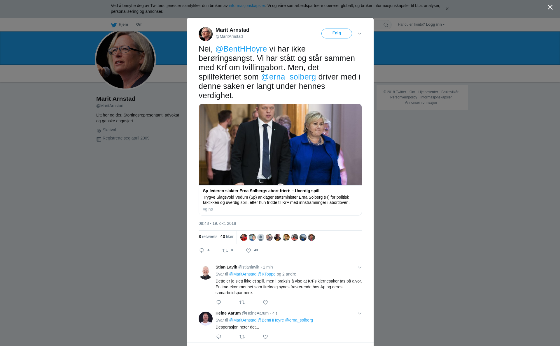 RT @MaritArnstad: Nei, @BentHHoyre vi har ikke berøringsangst. Vi har stått og står sammen med Krf om tvillingabort. Men, det spillfekteriet som @erna_solberg driver med i denne saken er langt under hennes verdighet. https://t.co/23BJSXUoLi