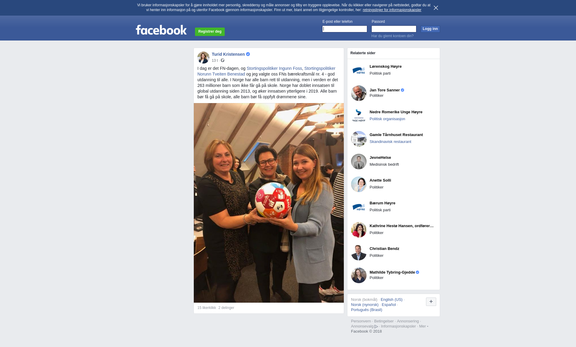 I dag er det FN-dagen, og Stortingspolitiker Ingunn Foss, Stortingspolitiker Norunn Tveiten Benestad og jeg valgte oss FNs bærekraftsmål nr. 4 - god utdanning til alle. I Norge har alle barn rett til utdanning, men i verden er det 263 millioner barn som ikke får gå på skole. Norge har doblet innsatsen til global utdanning siden 2013, og øker innsatsen ytterligere i 2019. Alle barn bør få gå på skole, alle barn bør få oppfylt drømmene sine.