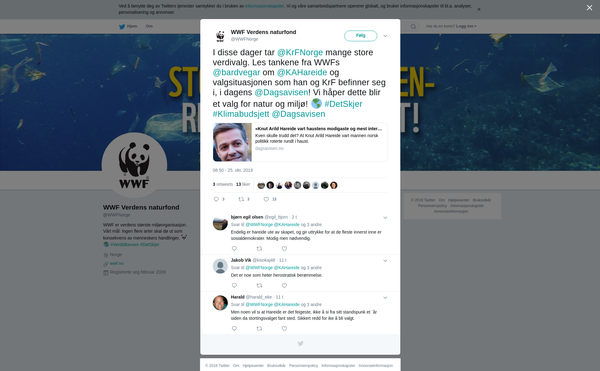 RT @WWFNorge: I disse dager tar @KrFNorge mange store verdivalg. Les tankene fra WWFs @bardvegar om @KAHareide og valgsituasjonen som han og KrF befinner seg i, i dagens @Dagsavisen! Vi håper dette blir et valg for natur og miljø! 🌎 #DetSkjer #Klimabudsjett @Dagsavisen https://t.co/iE77ctdbje