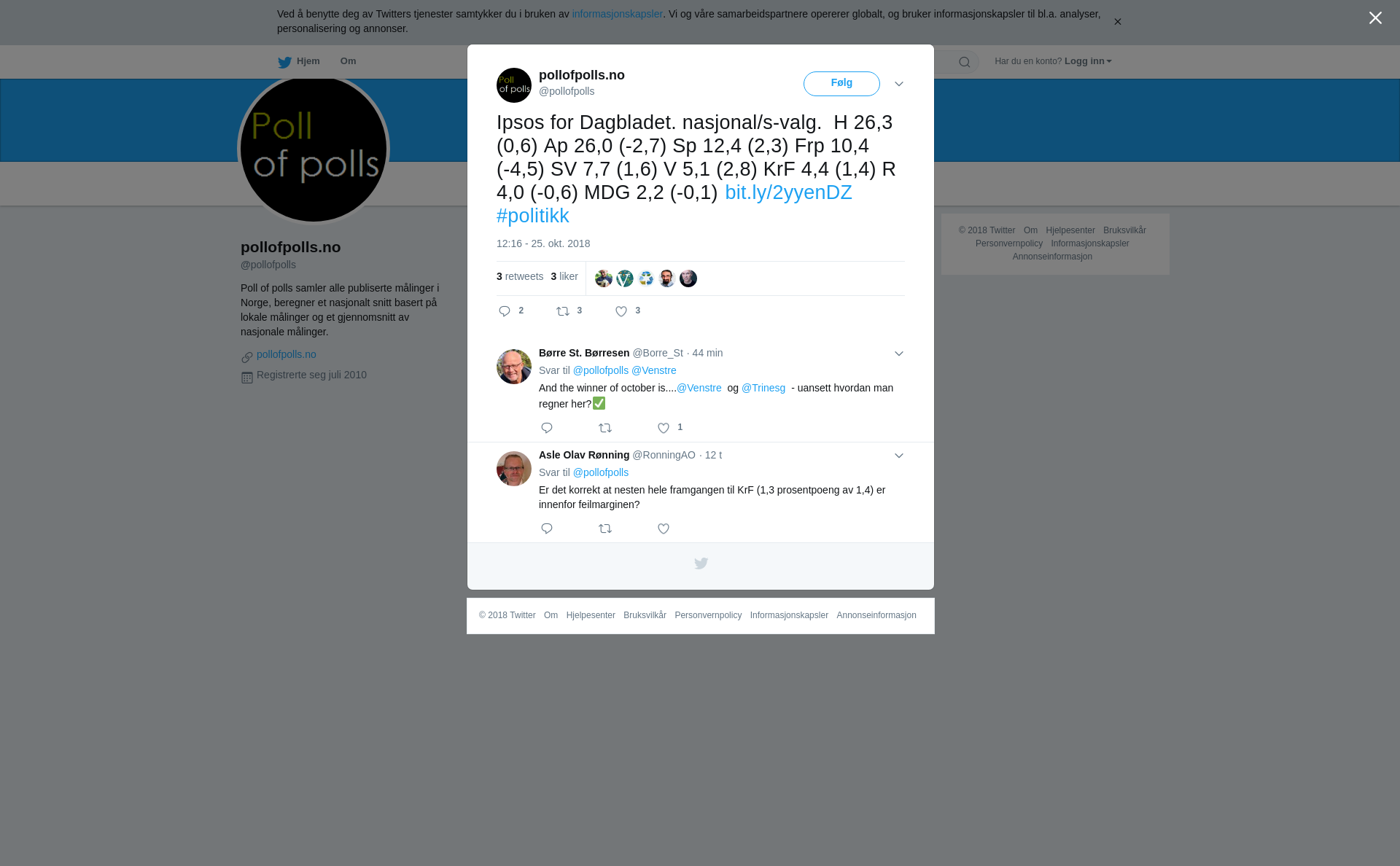 RT @pollofpolls: Ipsos for Dagbladet. nasjonal/s-valg. H 26,3 (0,6) Ap 26,0 (-2,7) Sp 12,4 (2,3) Frp 10,4 (-4,5) SV 7,7 (1,6) V 5,1 (2,8) KrF 4,4 (1,4) R 4,0 (-0,6) MDG 2,2 (-0,1) https://t.co/xijpBOYICn #politikk