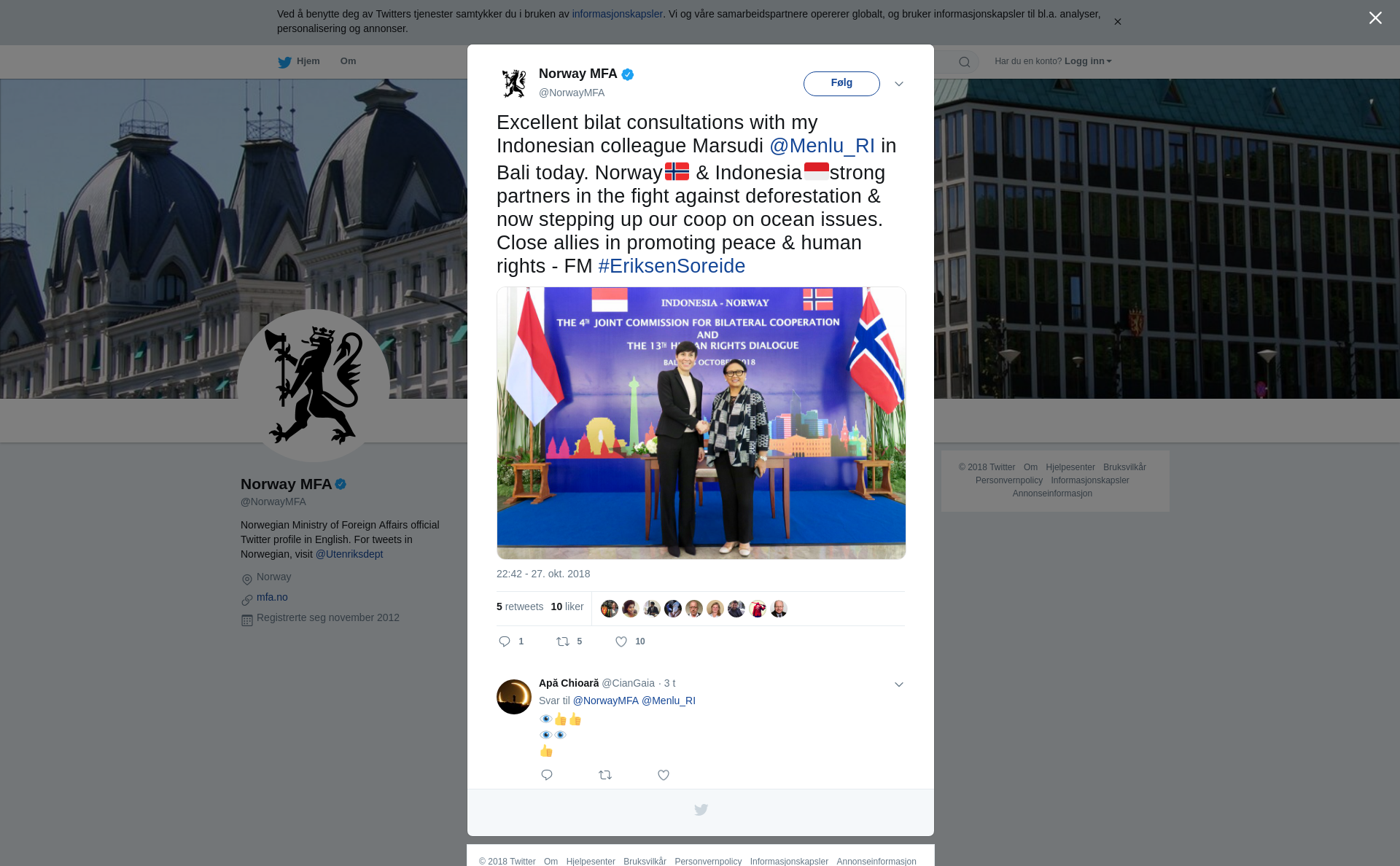 Excellent bilat consultations with my Indonesian colleague Marsudi @Menlu_RI in Bali today. Norway🇳🇴 & Indonesia🇮🇩strong partners in the fight against deforestation & now stepping up our coop on ocean issues. Close allies in promoting peace & human rights - FM #EriksenSoreide https://t.co/udhaoAbwet