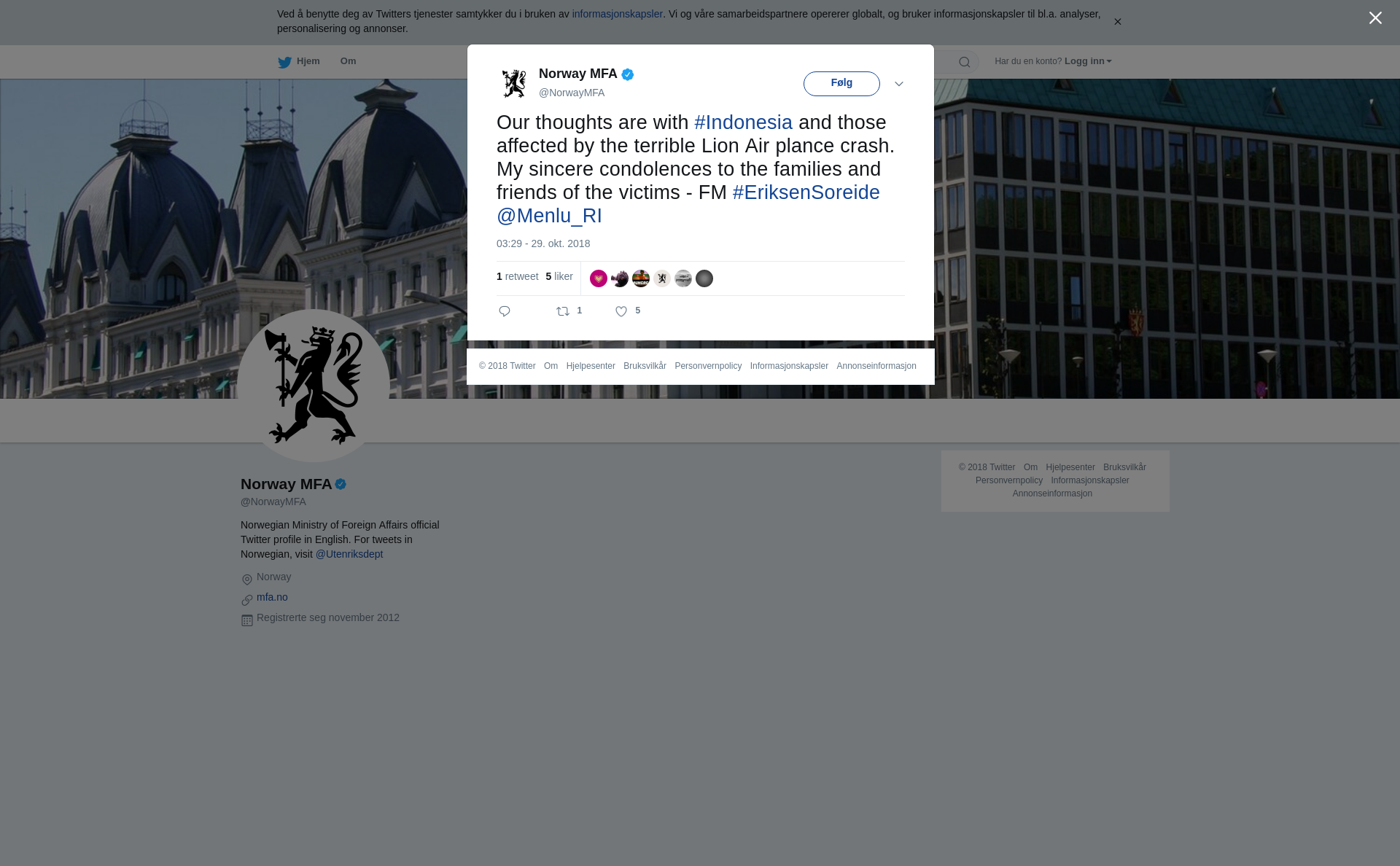 Our thoughts are with #Indonesia and those affected by the terrible Lion Air plance crash. My sincere condolences to the families and friends of the victims - FM #EriksenSoreide @Menlu_RI