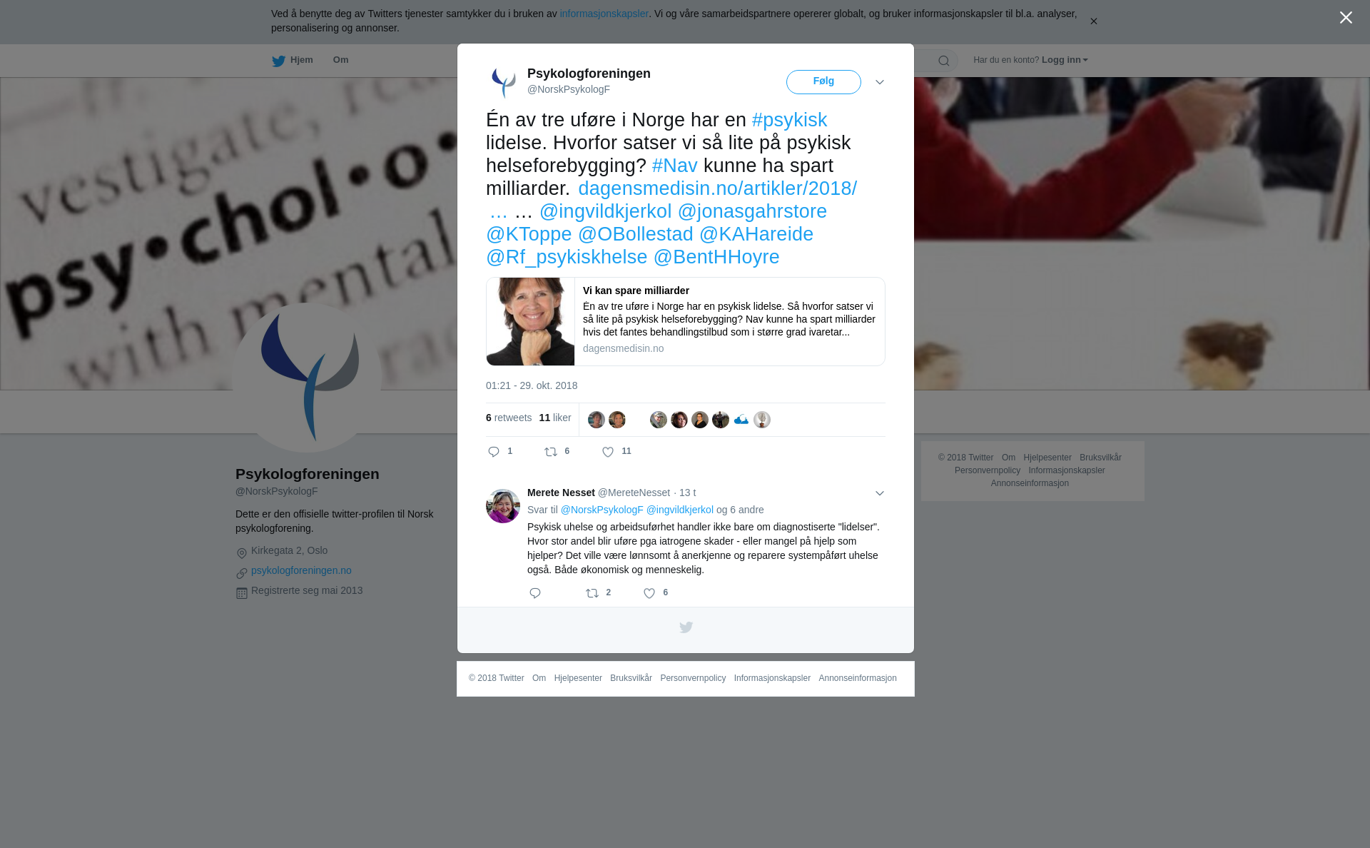 RT @NorskPsykologF: Én av tre uføre i Norge har en #psykisk lidelse. Hvorfor satser vi så lite på psykisk helseforebygging? #Nav kunne ha spart milliarder. https://t.co/1qR7SBRCc6 … @ingvildkjerkol @jonasgahrstore @KToppe @OBollestad @KAHareide @Rf_psykiskhelse @BentHHoyre