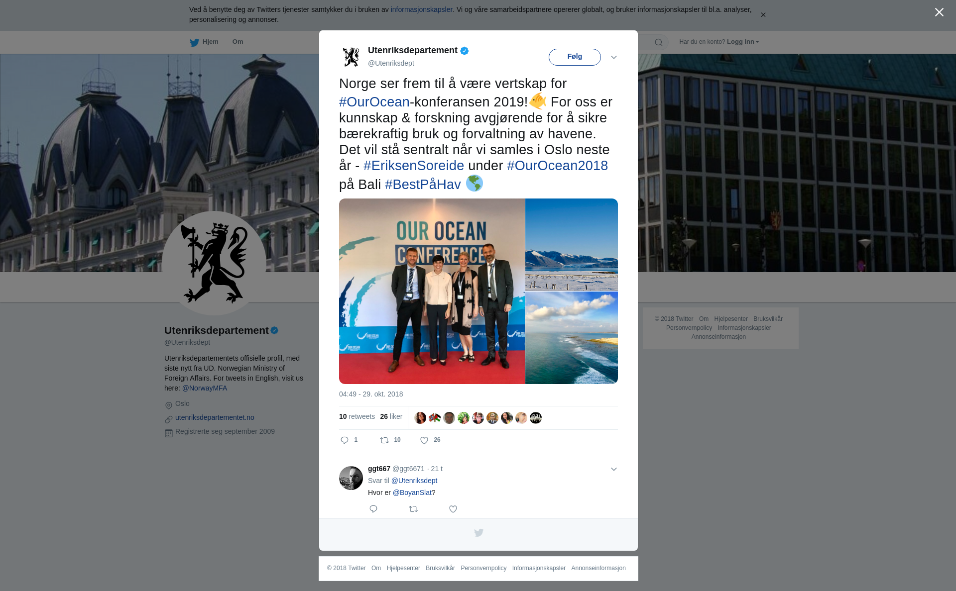 RT @Utenriksdept: Norge ser frem til å være vertskap for #OurOcean-konferansen 2019!🐠 For oss er kunnskap & forskning avgjørende for å sikre bærekraftig bruk og forvaltning av havene. Det vil stå sentralt når vi samles i Oslo neste år - #EriksenSoreide under #OurOcean2018 på Bali #BestPåHav 🌎 https://t.co/415r3B07zO