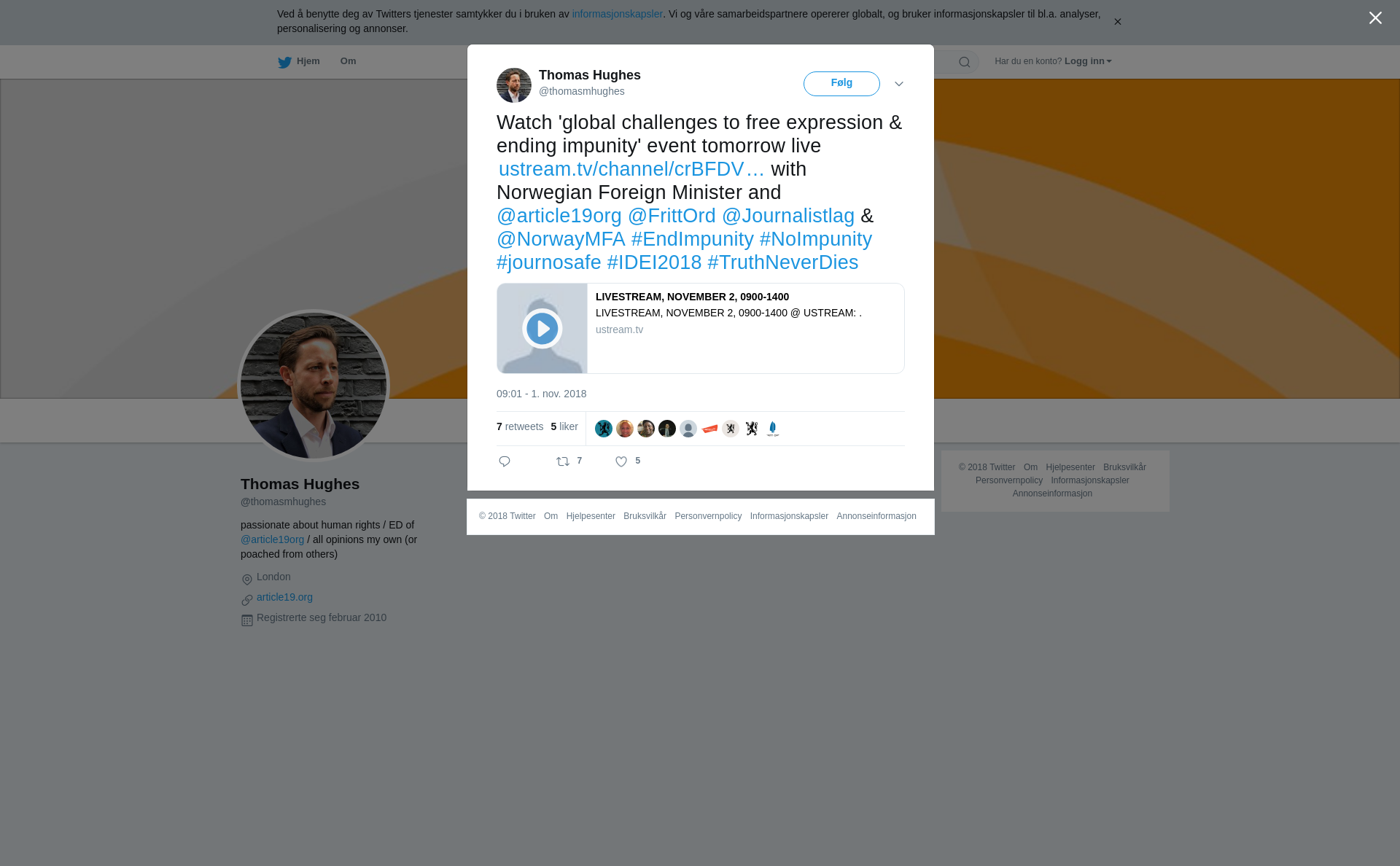 RT @thomasmhughes: Watch 'global challenges to free expression & ending impunity' event tomorrow live https://t.co/S8RpPiptL2 with Norwegian Foreign Minister and @article19org @FrittOrd @Journalistlag & @NorwayMFA #EndImpunity #NoImpunity #journosafe #IDEI2018 #TruthNeverDies