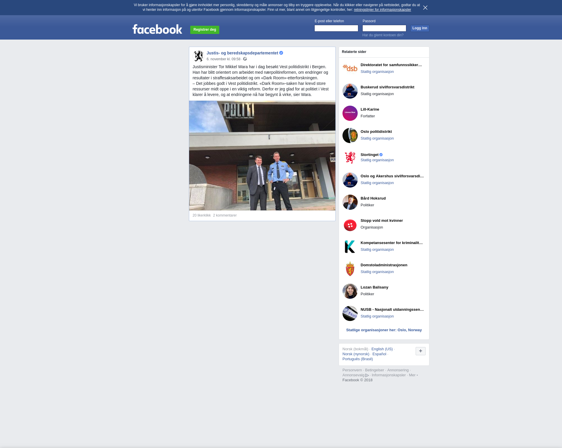 Justisminister Tor Mikkel Wara har i dag besøkt Vest politidistrikt i Bergen. Han har blitt orientert om arbeidet med nærpolitireformen, om endringer og resultater i straffesaksarbeidet og om «Dark Room»-etterforskningen.