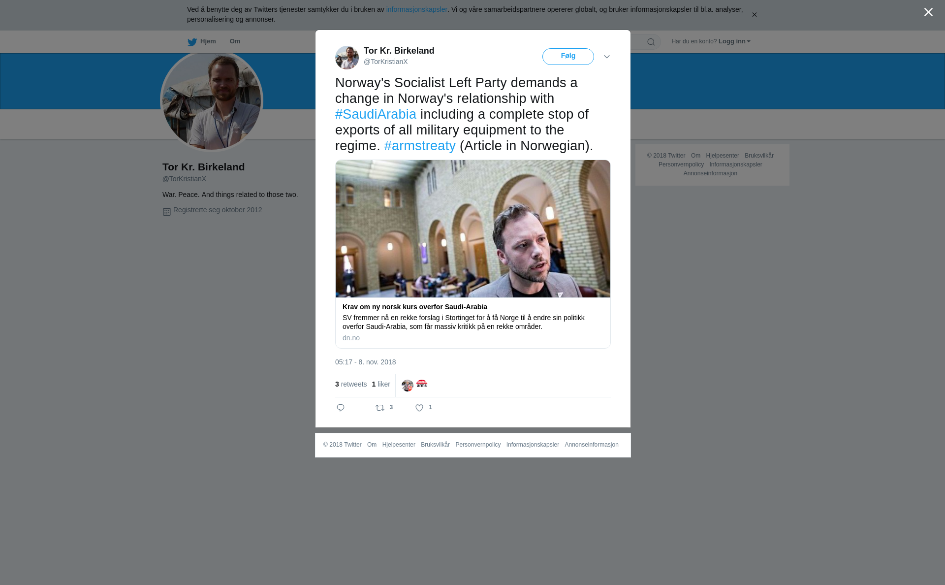 RT @TorKristianX: Norway's Socialist Left Party demands a change in Norway's relationship with #SaudiArabia including a complete stop of exports of all military equipment to the regime. #armstreaty (Article in Norwegian).