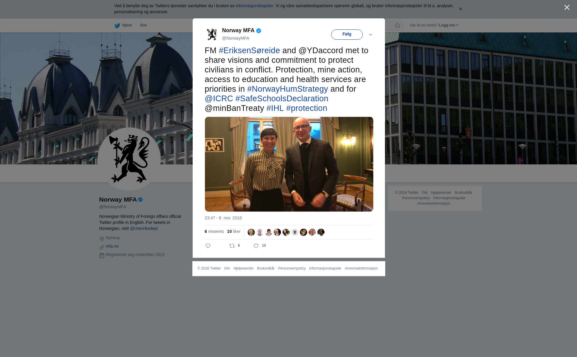 FM #EriksenSøreide and @YDaccord met to share visions and commitment to protect civilians in conflict. Protection, mine action, access to education and health services are priorities in #NorwayHumStrategy and for @ICRC #SafeSchoolsDeclaration @minBanTreaty #IHL #protection https://t.co/enA0WR9Oql