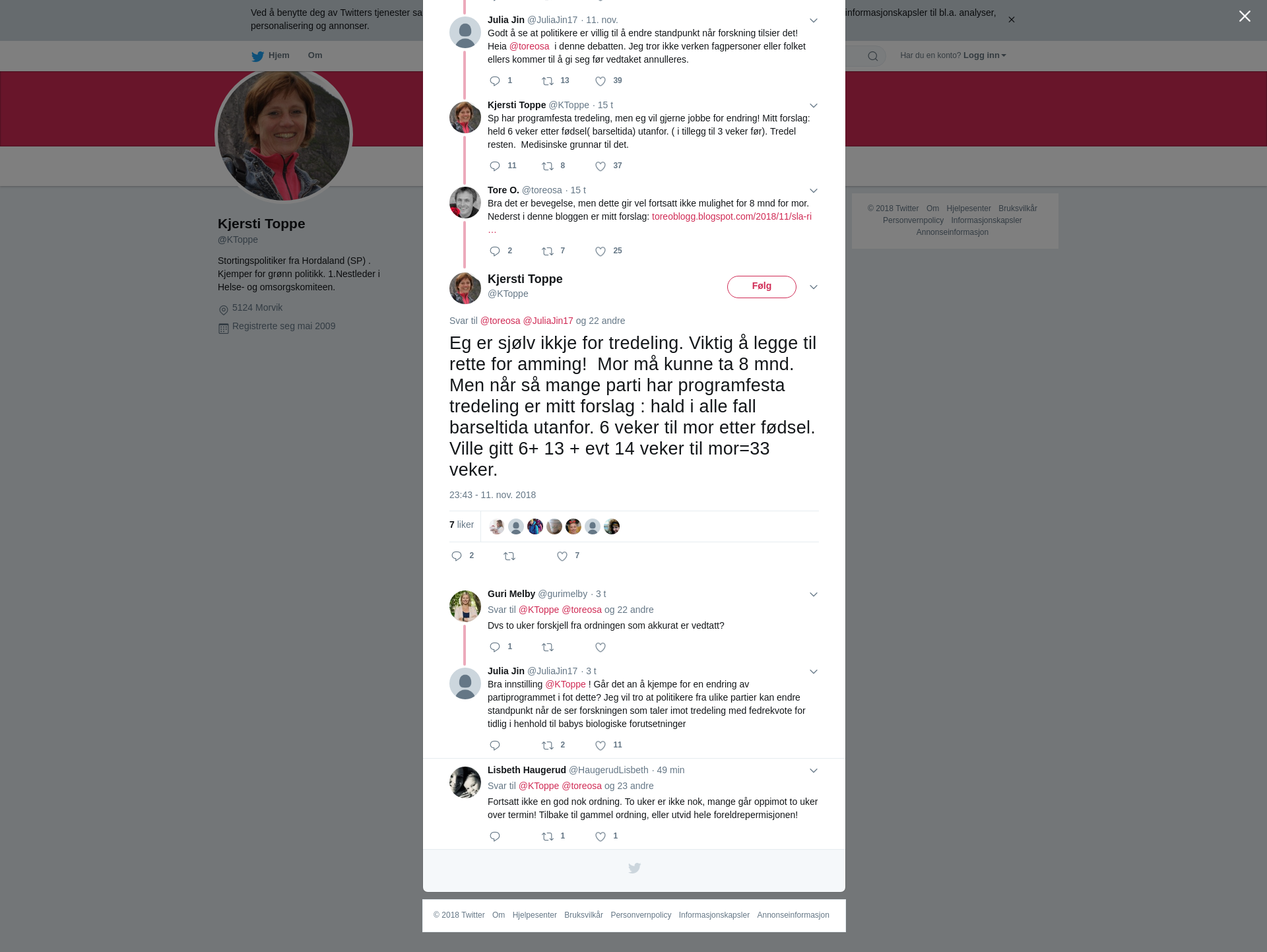 @toreosa @JuliaJin17 @gurimelby @JordmorHanne @Tholien @MLilleborge @Trinesg @NSFJordmor @SandenHanne @erna_solberg @MikkelsonNina @Stortinget @KrFNorge @Venstre @Hoyre @frp_no @Helsedir @OBollestad @ingvildkjerkol @Lindacath @KLMogstad @pedweb @legeforeningen @Arbeiderpartiet Eg er sjølv ikkje for tredeling. Viktig å legge til rette for amming! Mor må kunne ta 8 mnd. Men når så mange parti har programfesta tredeling er mitt forslag : hald i alle fall barseltida utanfor. 6 veker til mor etter fødsel. Ville gitt 6+ 13 + evt 14 veker til mor=33 veker.