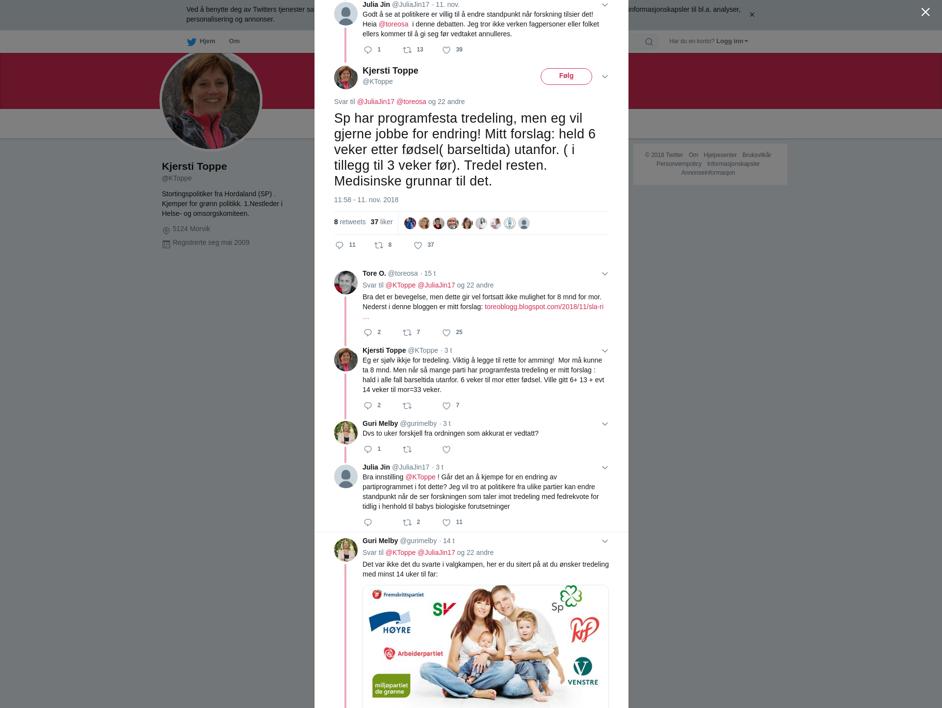 @JuliaJin17 @toreosa @gurimelby @JordmorHanne @Tholien @MLilleborge @Trinesg @NSFJordmor @SandenHanne @erna_solberg @MikkelsonNina @Stortinget @KrFNorge @Venstre @Hoyre @frp_no @Helsedir @OBollestad @ingvildkjerkol @Lindacath @KLMogstad @pedweb @legeforeningen @Arbeiderpartiet Sp har programfesta tredeling, men eg vil gjerne jobbe for endring! Mitt forslag: held 6 veker etter fødsel( barseltida) utanfor. ( i tillegg til 3 veker før). Tredel resten.  Medisinske grunnar til det.
