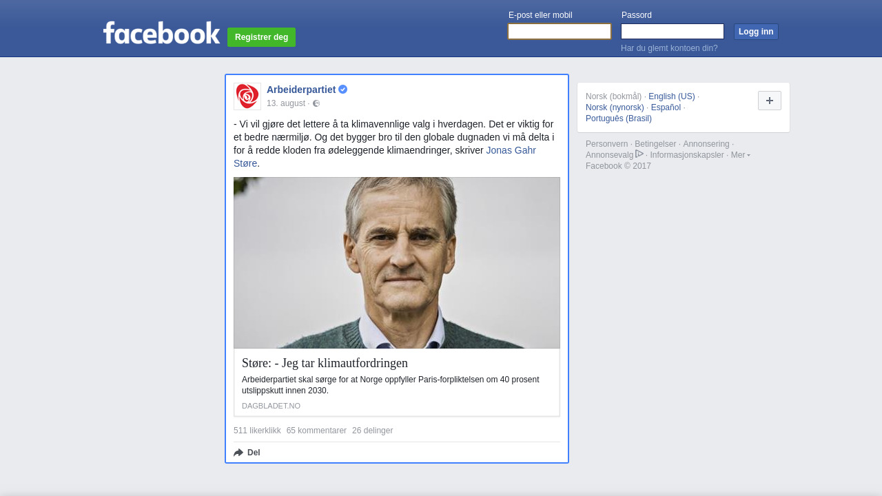 - Vi vil gjøre det lettere å ta klimavennlige valg i hverdagen. Det er viktig for et bedre nærmiljø. Og det bygger bro til den globale dugnaden vi må delta i for å redde kloden fra ødeleggende klimaendringer, skriver Jonas Gahr Støre.