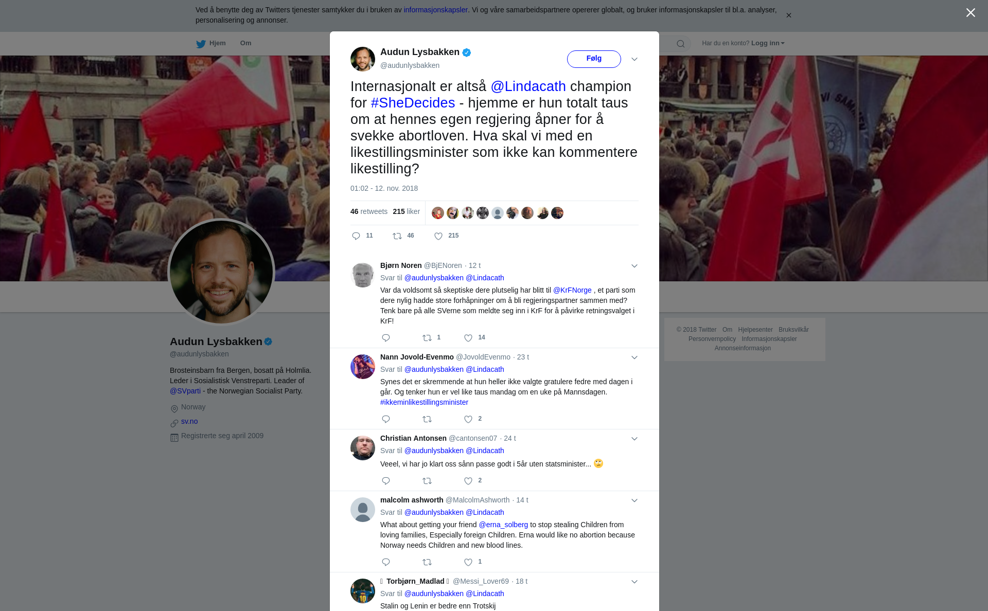 Internasjonalt er altså @Lindacath champion for #SheDecides - hjemme er hun totalt taus om at hennes egen regjering åpner for å svekke abortloven. Hva skal vi med en likestillingsminister som ikke kan kommentere likestilling?