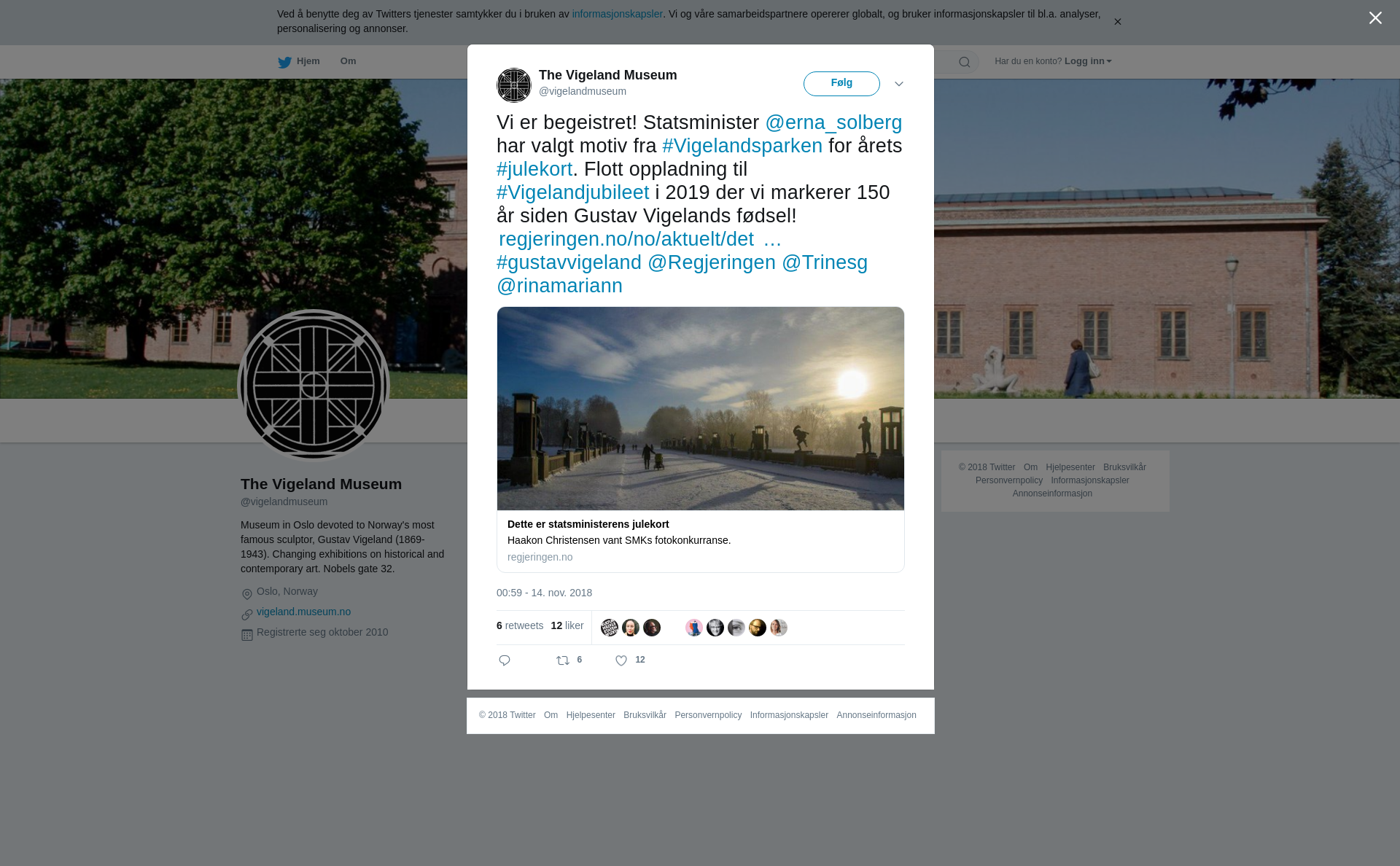 RT @vigelandmuseum: Vi er begeistret! Statsminister @erna_solberg har valgt motiv fra #Vigelandsparken for årets #julekort. Flott oppladning til #Vigelandjubileet i 2019 der vi markerer 150 år siden Gustav Vigelands fødsel! https://t.co/X9LmZjAxoP #gustavvigeland @Regjeringen @Trinesg @rinamariann