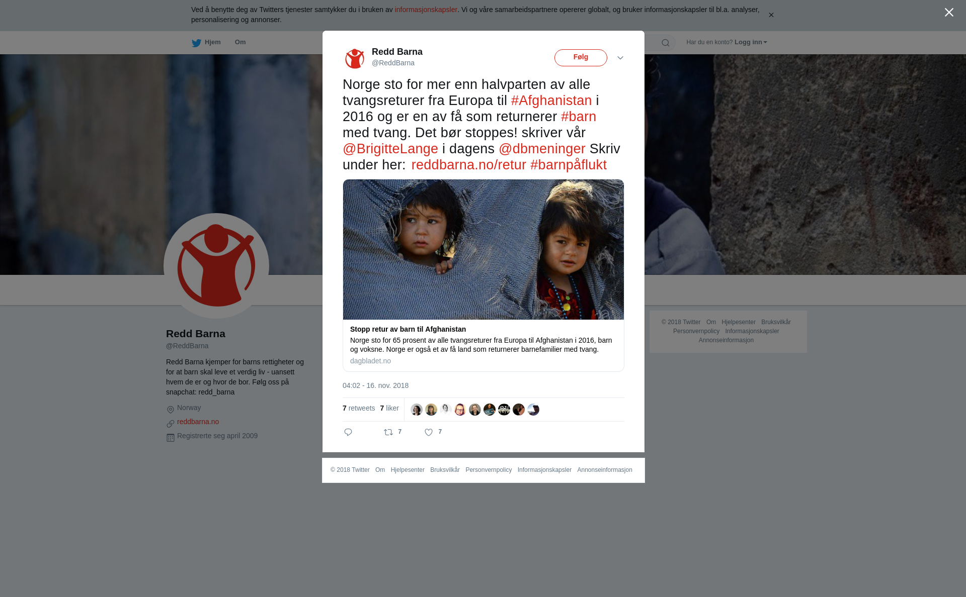 RT @ReddBarna: Norge sto for mer enn halvparten av alle tvangsreturer fra Europa til #Afghanistan i 2016 og er en av få som returnerer #barn med tvang. Det bør stoppes! skriver vår @BrigitteLange i dagens @dbmeninger Skriv under her: https://t.co/0AbNGfdclc #barnpåflukt https://t.co/9fOw9qaoUx