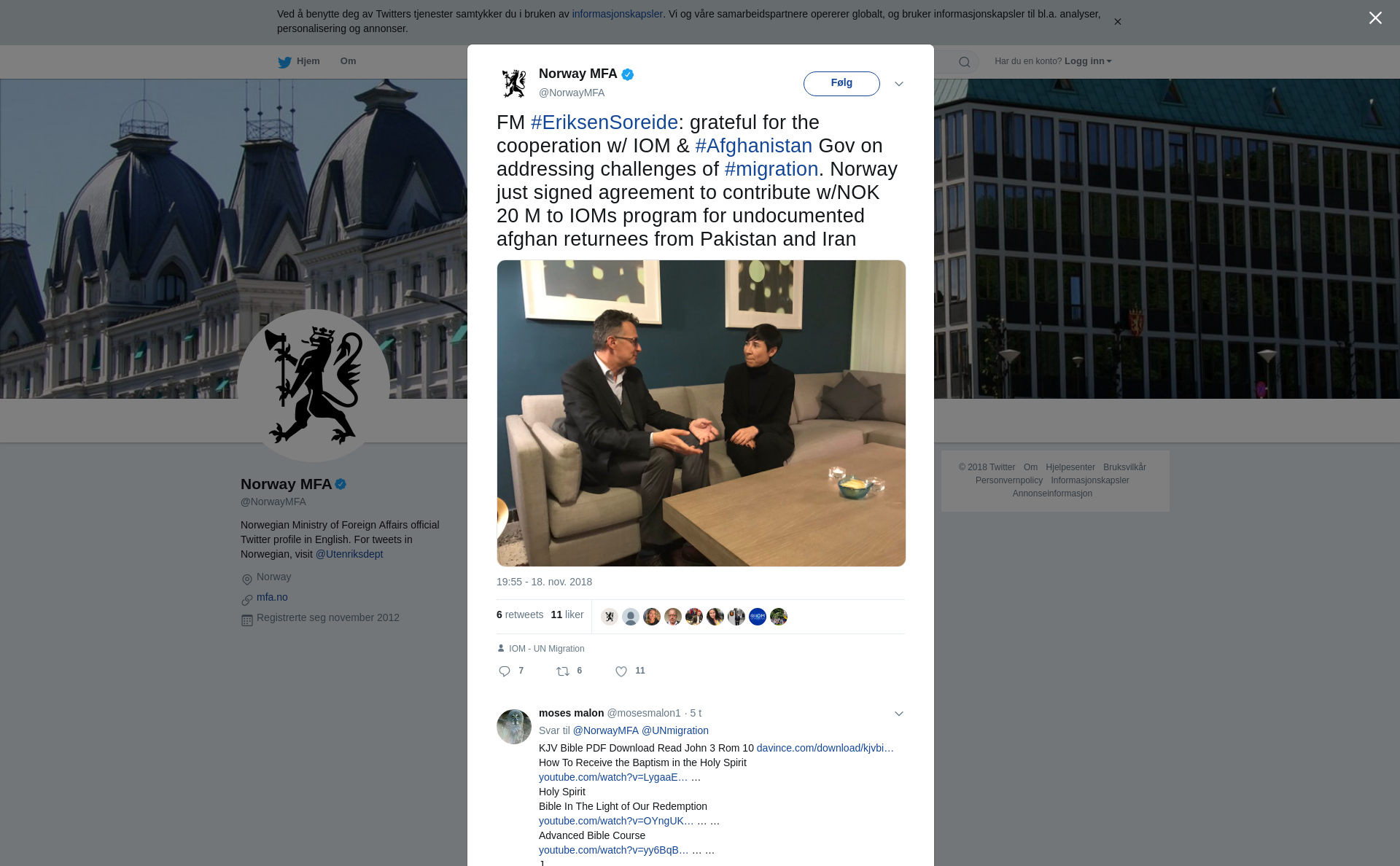 FM #EriksenSoreide: grateful for the cooperation w/ IOM & #Afghanistan Gov on addressing challenges of #migration. Norway just signed agreement to contribute w/NOK 20 M to IOMs program for undocumented afghan returnees from Pakistan and Iran https://t.co/EAiRcKdqyb