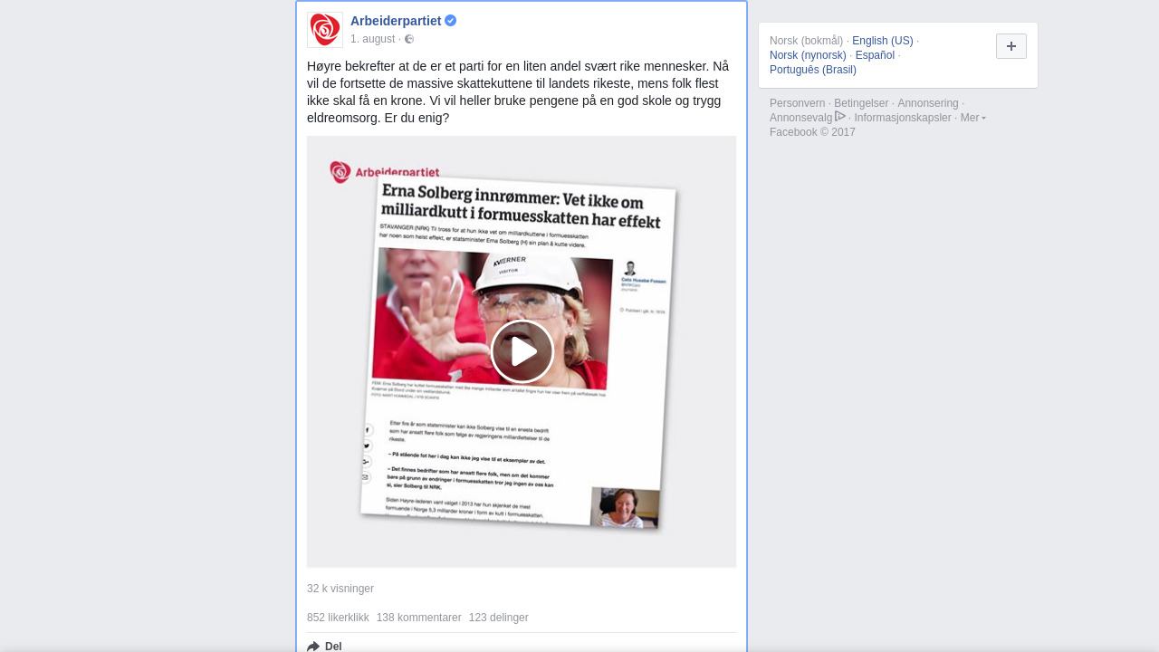 Høyre bekrefter at de er et parti for en liten andel svært rike mennesker. Nå vil de fortsette de massive skattekuttene til landets rikeste, mens folk flest ikke skal få en krone. Vi vil heller bruke pengene på en god skole og trygg eldreomsorg. Er du enig?
