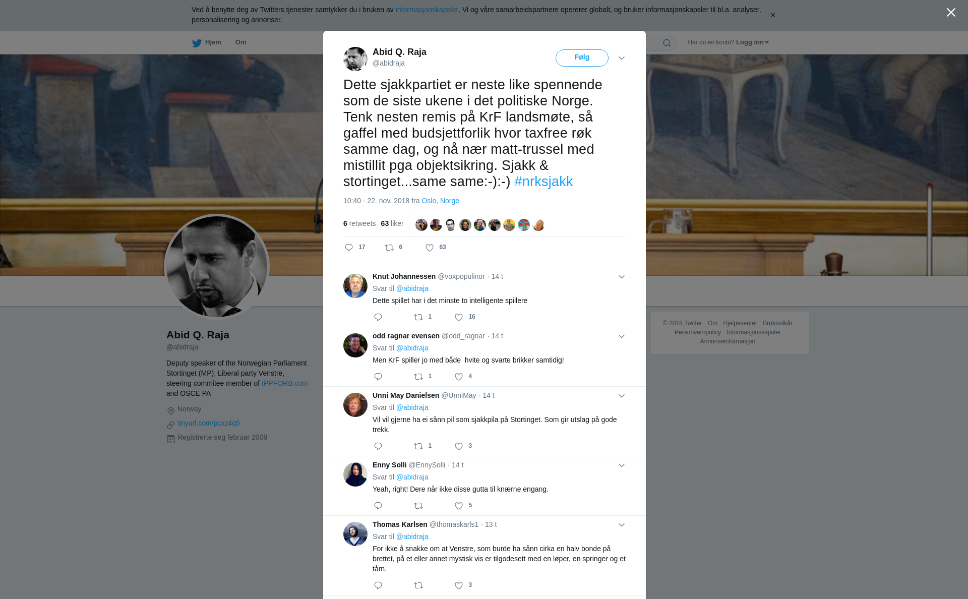 RT @abidraja: Dette sjakkpartiet er neste like spennende som de siste ukene i det politiske Norge. Tenk nesten remis på KrF landsmøte, så gaffel med budsjettforlik hvor taxfree røk samme dag, og nå nær matt-trussel med mistillit pga objektsikring. Sjakk & stortinget...same same:-):-) #nrksjakk