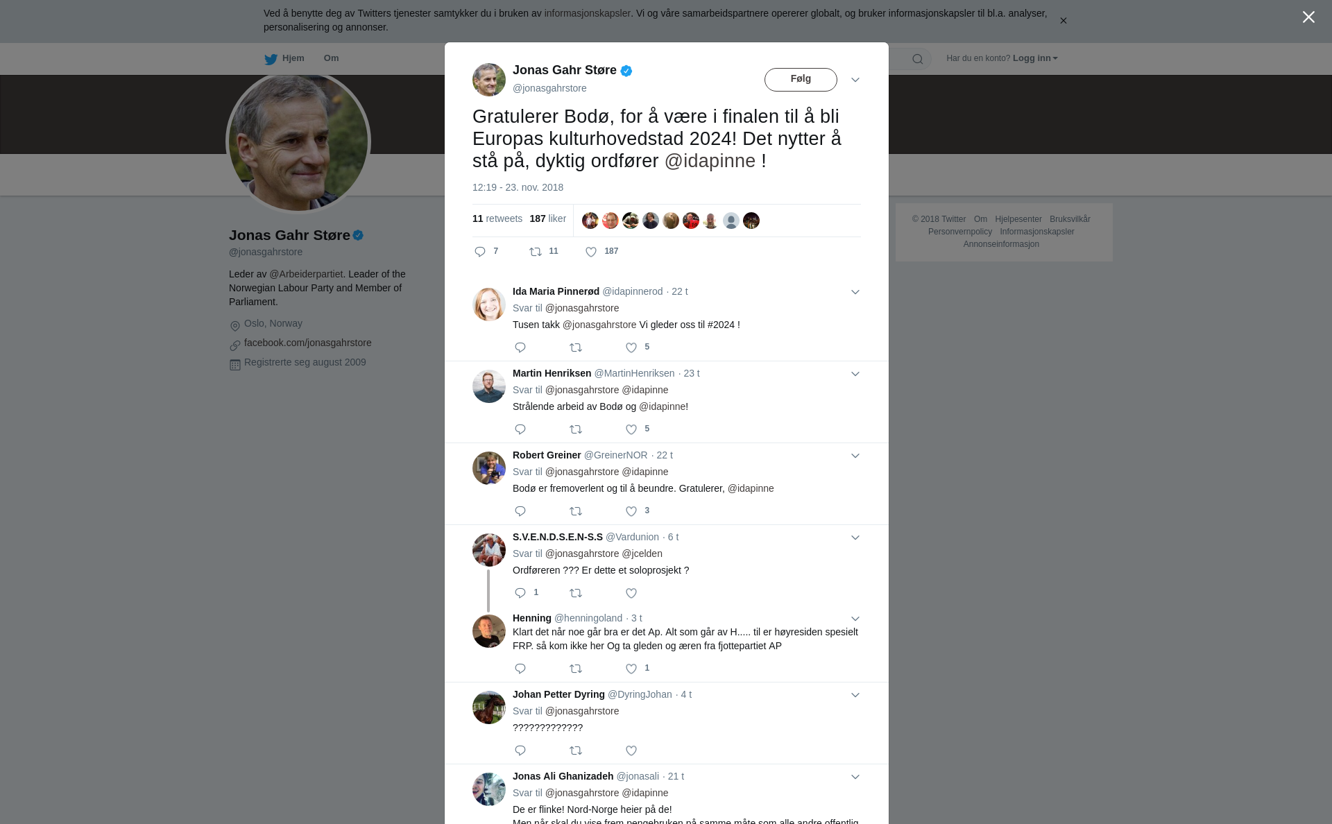 RT @jonasgahrstore: Gratulerer Bodø, for å være i finalen til å bli Europas kulturhovedstad 2024! Det nytter å stå på, dyktig ordfører @idapinne !