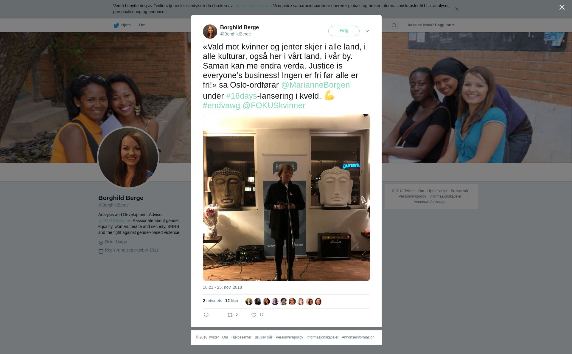 RT @BorghildBerge: «Vald mot kvinner og jenter skjer i alle land, i alle kulturar, også her i vårt land, i vår by. Saman kan me endra verda. Justice is everyone’s business! Ingen er fri før alle er fri!» sa Oslo-ordførar @MarianneBorgen under #16days-lansering i kveld. 💪 #endvawg @FOKUSkvinner https://t.co/jklKzv3nc2