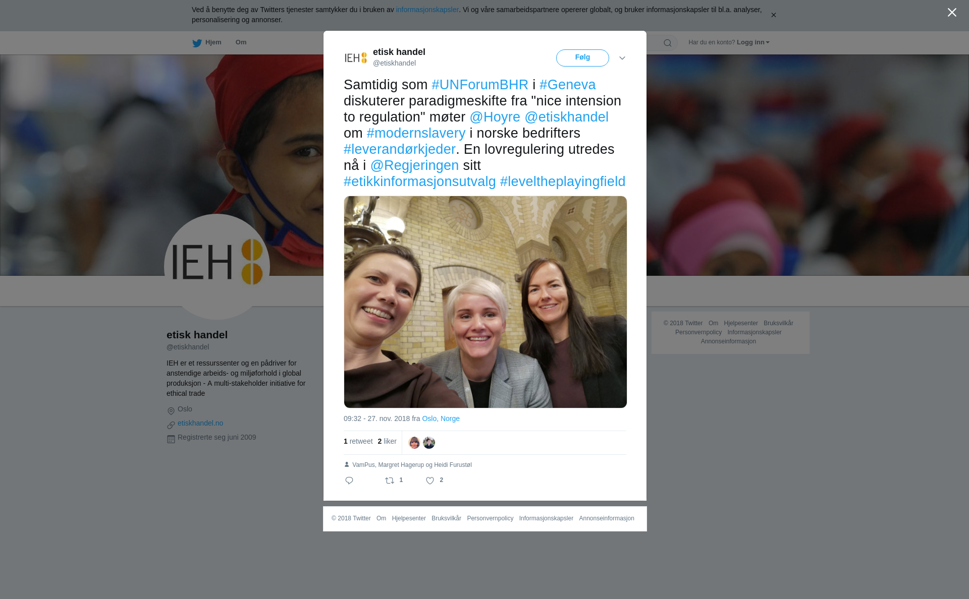 RT @etiskhandel: Samtidig som #UNForumBHR i #Geneva diskuterer paradigmeskifte fra "nice intension to regulation" møter @Hoyre @etiskhandel om #modernslavery i norske bedrifters #leverandørkjeder. En lovregulering utredes nå i @Regjeringen sitt #etikkinformasjonsutvalg #leveltheplayingfield https://t.co/KLX2RczGEq