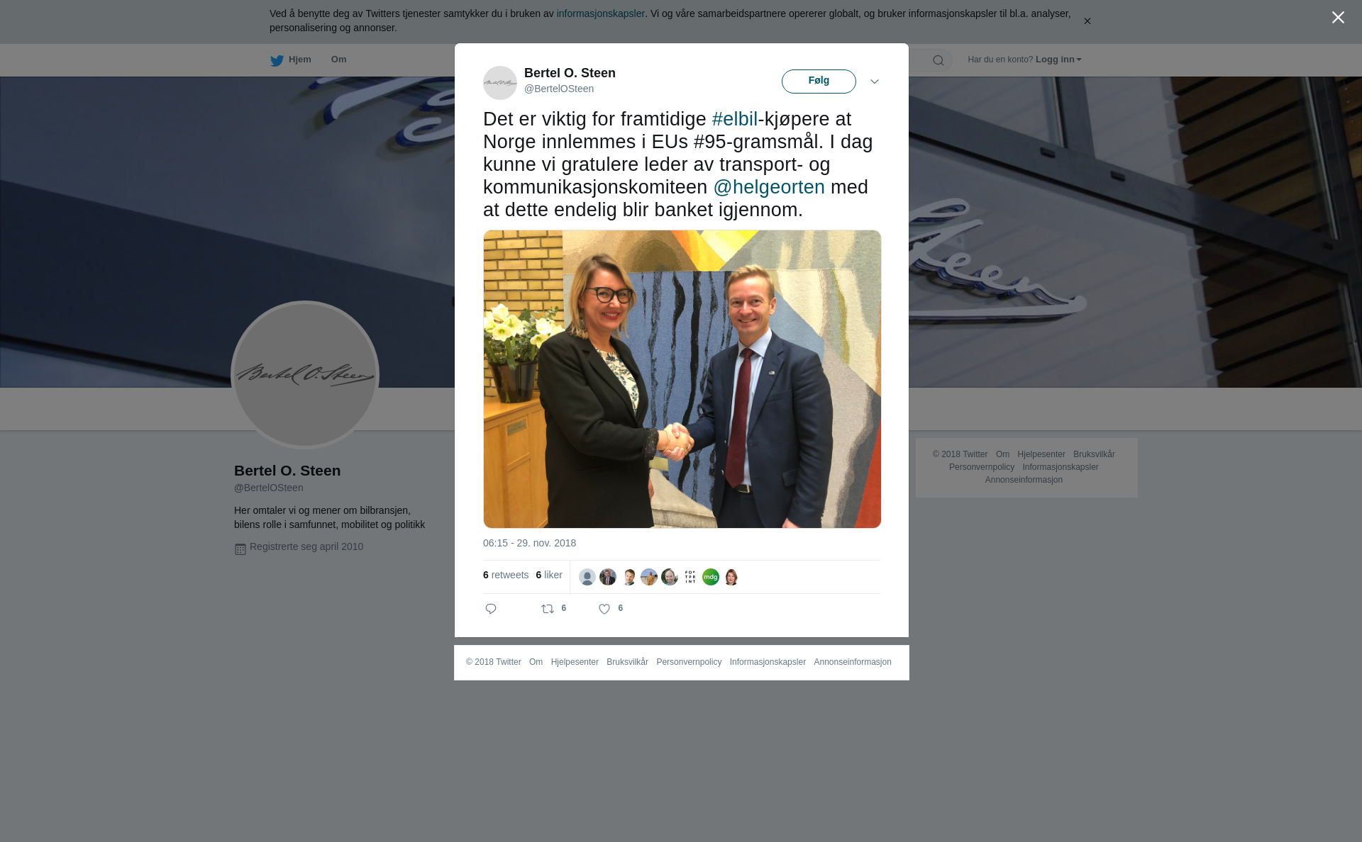 RT @BertelOSteen: Det er viktig for framtidige #elbil-kjøpere at Norge innlemmes i EUs #95-gramsmål. I dag kunne vi gratulere leder av transport- og kommunikasjonskomiteen @helgeorten med at dette endelig blir banket igjennom. https://t.co/fCUb7Rvs1y