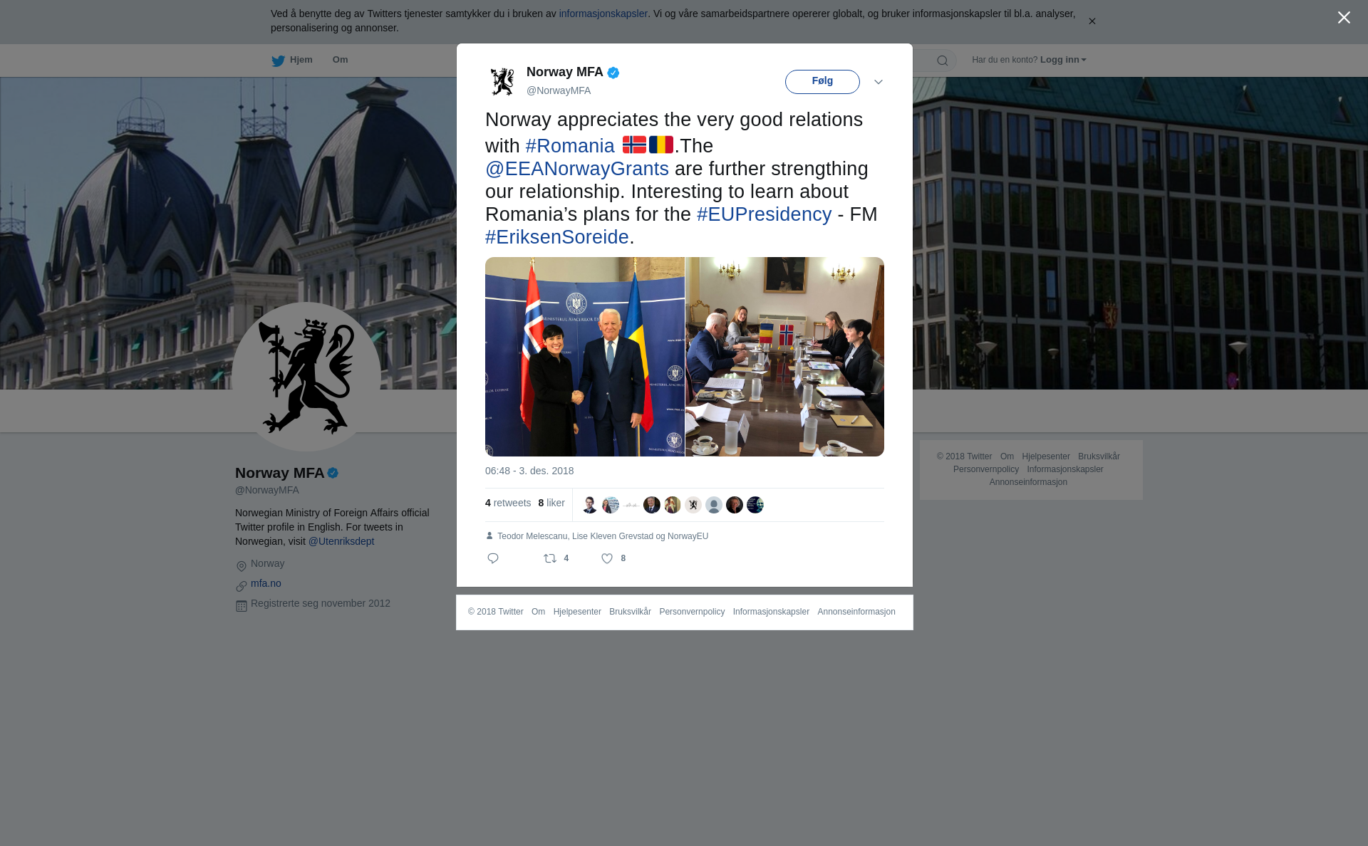 Norway appreciates the very good relations with #Romania 🇳🇴🇹🇩.The @EEANorwayGrants are further strengthing our relationship. Interesting to learn about Romania’s plans for the #EUPresidency - FM #EriksenSoreide. https://t.co/t63EhD4m3G
