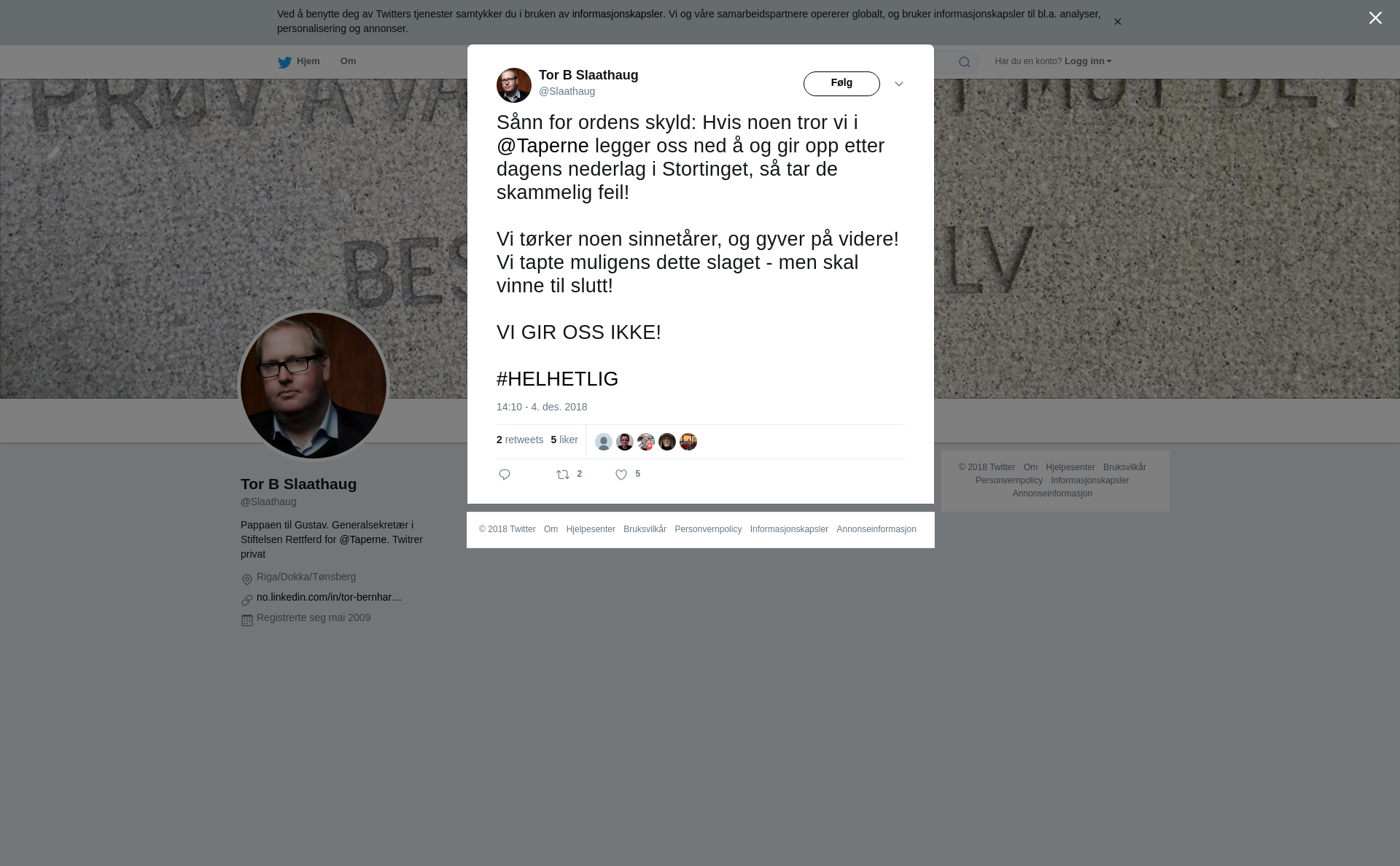 RT @Slaathaug: Sånn for ordens skyld: Hvis noen tror vi i @Taperne legger oss ned å og gir opp etter dagens nederlag i Stortinget, så tar de skammelig feil!